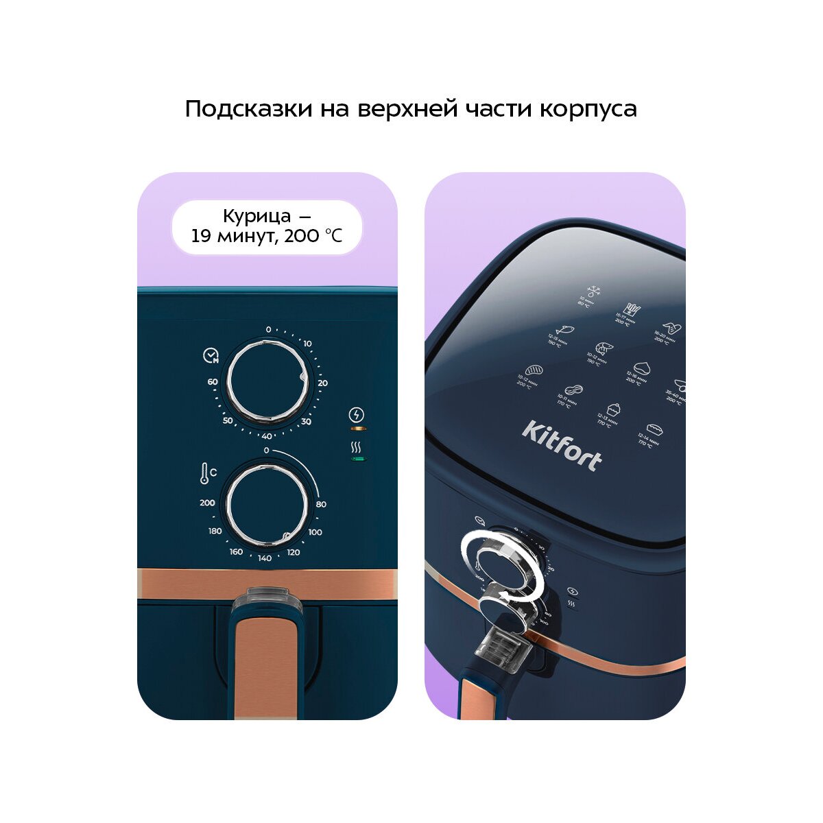Управление аэрогриля осуществляется с помощью регуляторов на передней части корпуса. На верхней части аэрогриля вы можете прочитать, какие показатели необходимо выставить для того или иного режима
