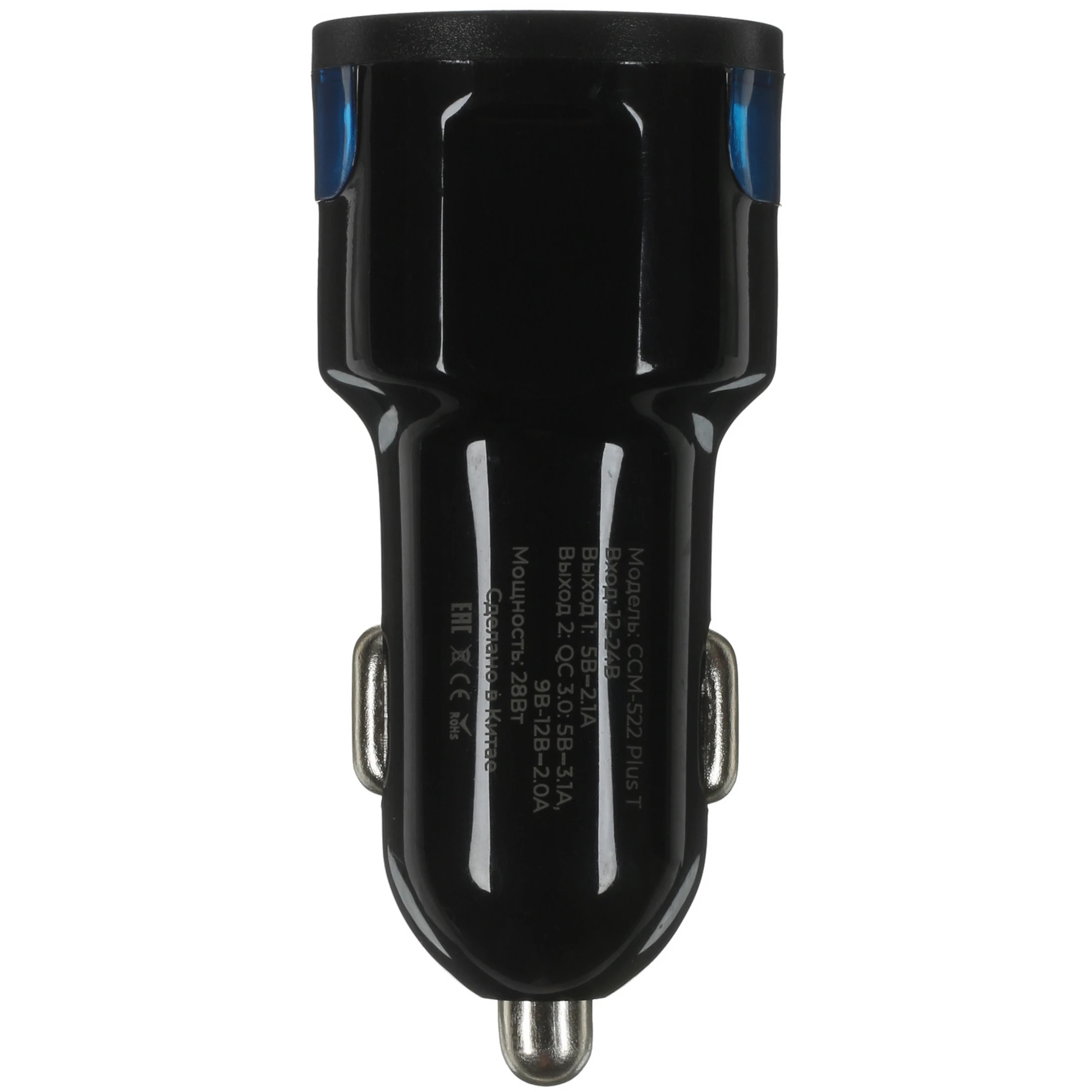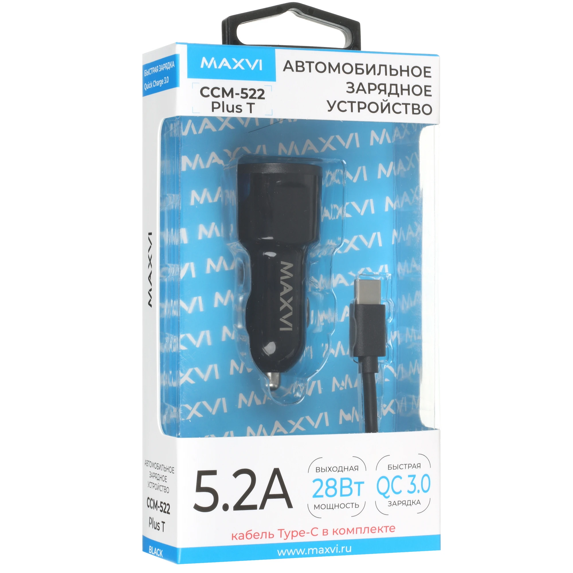 АЗУ Maxvi CCM-522 Plus T black 5.2A, 2xUSB, QC3.0 подсветка синяя