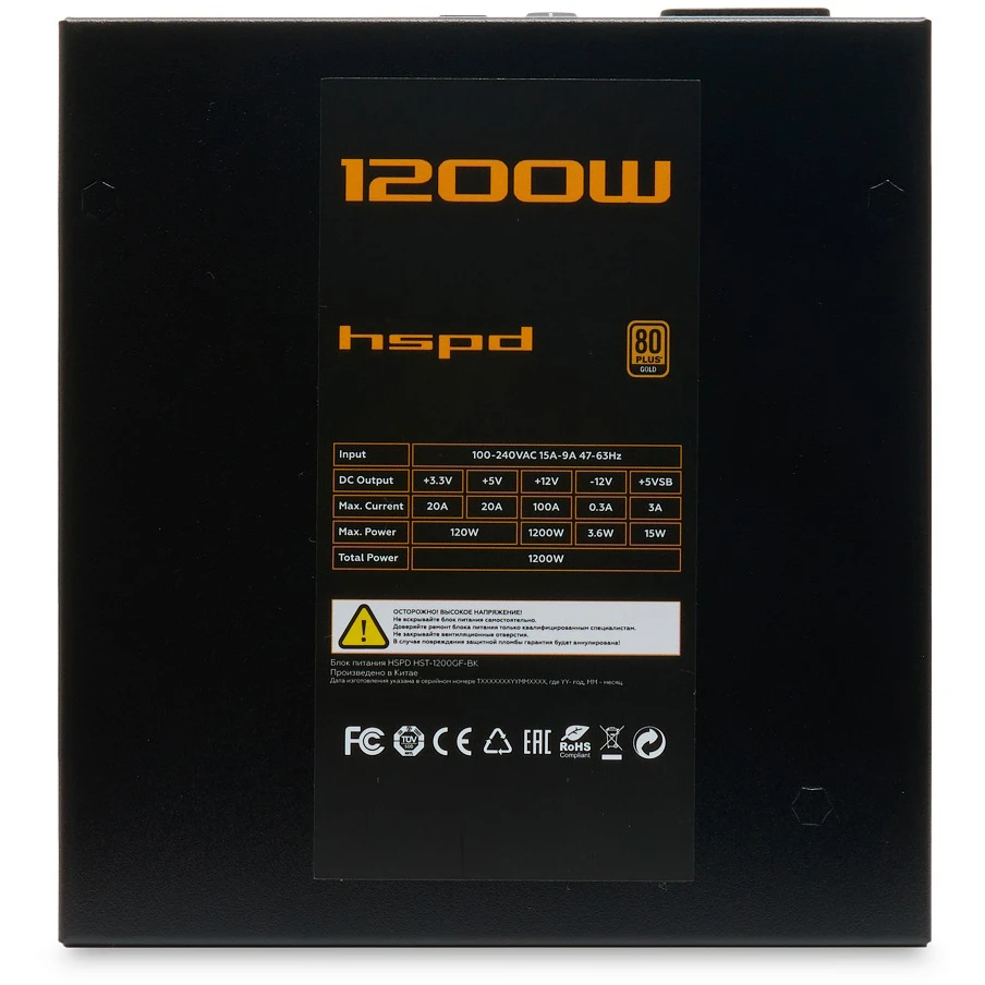 Блок питания HSPD HST-1200GF-BK 1200W 80+ Gold (ATX, 2.52, Full modular, 1x24(20+4)pin 600mm, 2xCPU 8(4+4)pin 700mm, 2xPCIe*2 8(6+2)pin