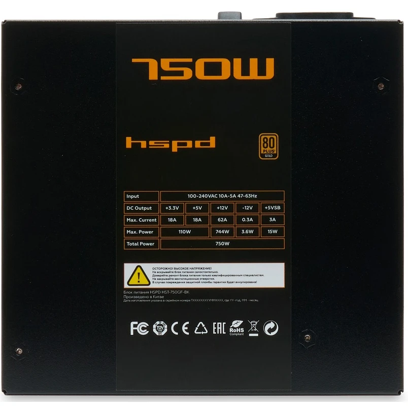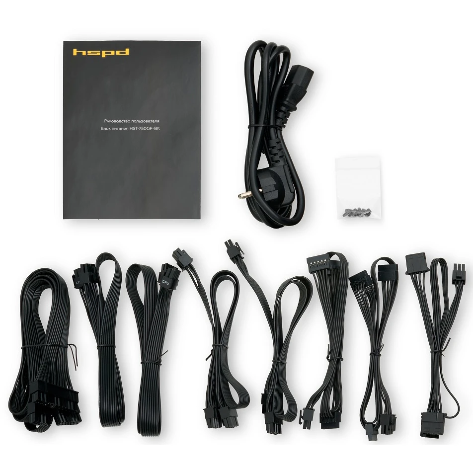 Блок питания HSPD HST-750GF-BK 750W 80+ Gold (ATX, 2.52, Full modular, 1x24(20+4)pin 600mm, 2xCPU 8(4+4)pin 700mm, 2xPCIe*2 8(6+2)pin