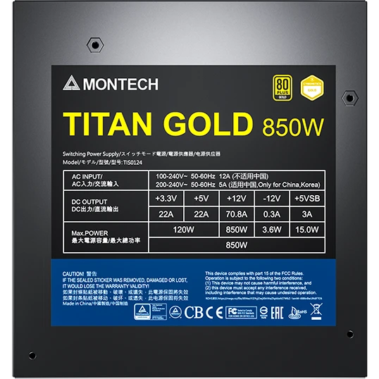 Блок питания Montech Titan Gold 850W / ATX 3.0, APFC, 80 Plus Gold, Half Bridge LLC, DC-DC, Japan caps, 135mm fan, full modular