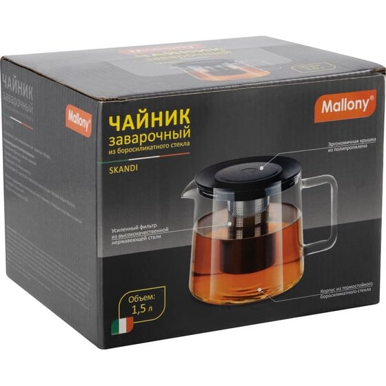 Заварочный чайник Mallony Skandi, объем 1.5 л, из боросиликатного стекла, с прямоугольной ручкой 910126 предназначен для использования в офисе или дома.