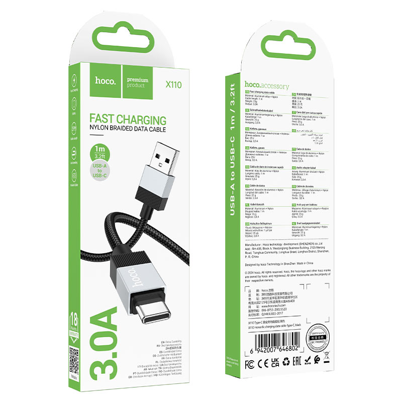 X110 Honorific, кабель для передачи данных от USB к Type-C, ток до 3 А, нейлоновая оплетка, разъемы из алюминиевого сплава, длина – 1 м