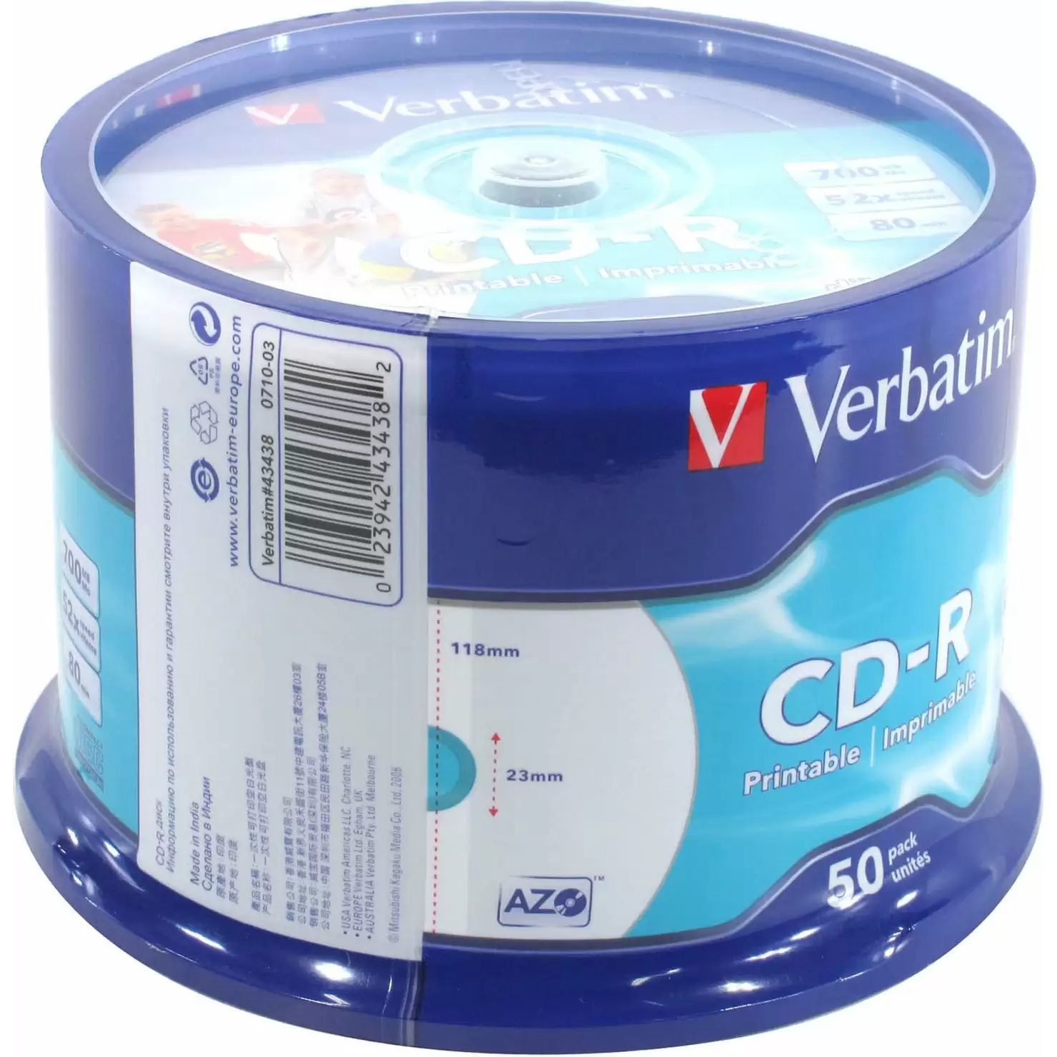 Диск CD-R Verbatim (43438) 700 Mb, 52x, Cake Box (50), DL+, Full Ink Printable (50/200)