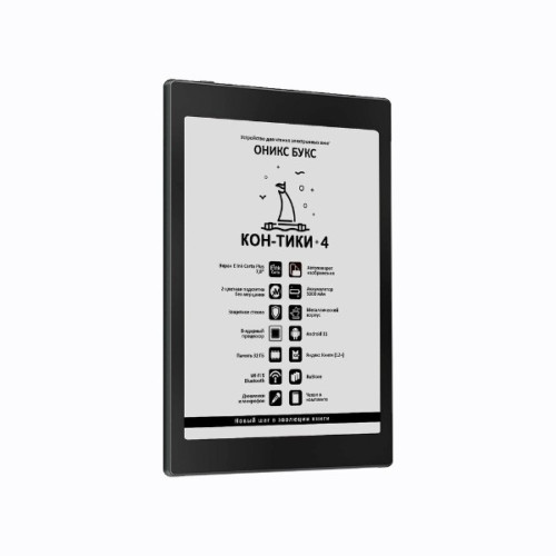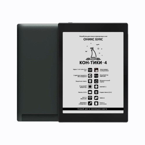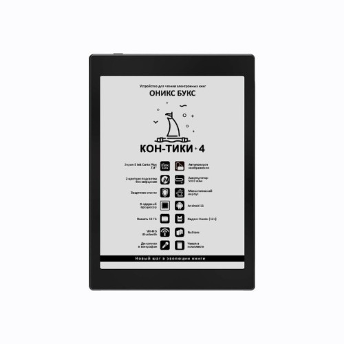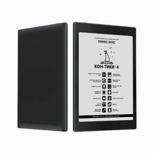 ОНИКС БУКС Кон-Тики 4 – это электронная книга очень удачного формата: площадь её дисплея на 68% больше площади куда более распространённых 6-дюймовых дисплеев, но габариты и вес устройства при этом достаточно скромные. На таком ридере можно с комфортом читать как художественную литературу, так и многие файлы в форматах PDF и DJVU; кроме того, Кон-Тики 4 подойдёт и для чтения различных документов и статей в интернете, работы со словарями, онлайн-переводчиками и облачными сервисами, прослушивания аудиокниг и музыки.