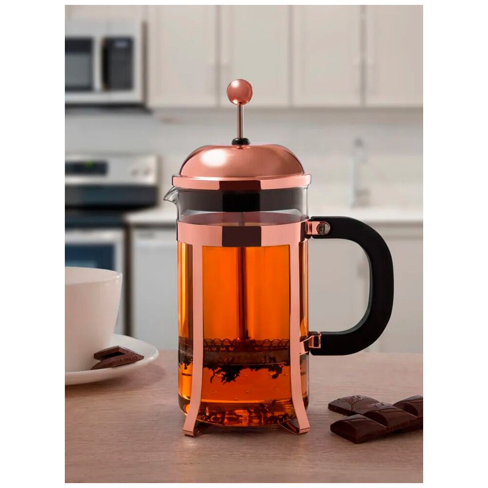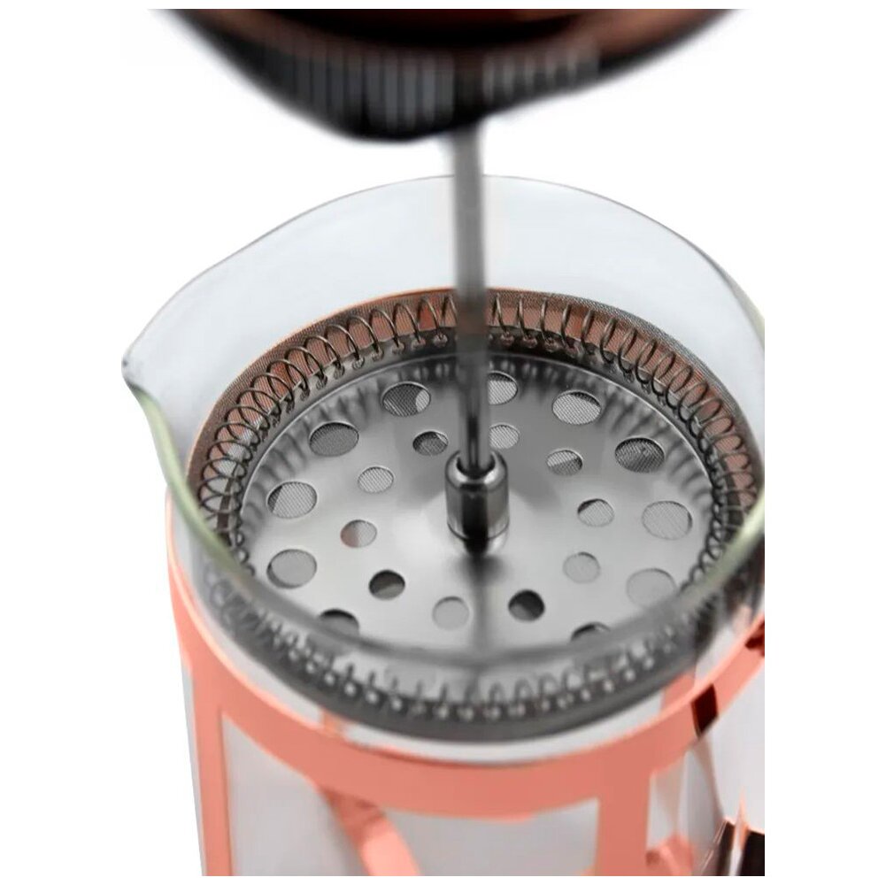 Френч-пресс изготовлен из стекла, пластика и высококачественной нержавеющей стали. Предназначен для приготовления кофе или чая, методом настаивания и отжима. Колба из боросиликатного стекла жароустойчива, выдерживает температуру 100°С, не впитывает запахи. Пресс-фильтр плотно прижимает частички кофе или заварки ко дну френч-пресса, а уплотнительное кольцо не дает им попасть в напиток. Прозрачный корпус позволяет наблюдать за процессом насыщения напитка. У френч-пресса удобная ручка, плотная закрывающаяся крышка.