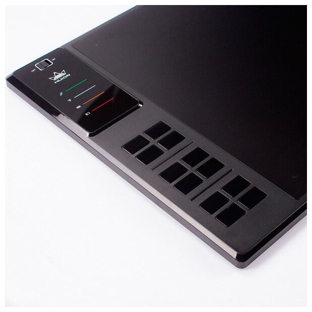 частота беспроводной связи 2.4G; поддержка наклона ±60°; скорость отклика 266PPS; точность: ±0.3mm; экспресс клавиши: 12 настраиваемых экспресс-клавиш; спящий режим: 10 минут; дальность соединения: 5-10 м; емкость батареи: 2000 мАч; потребление в режиме ожидания: 0,4 Вт; время зарядки: около 6 часов