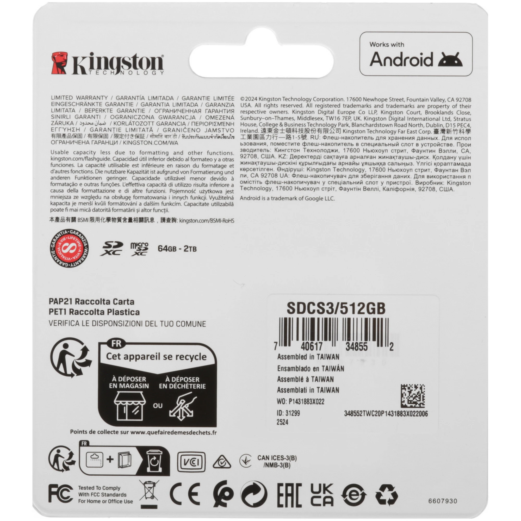 Карта памяти Kingston microSDXC 512 ГБ [SDCS3/512GB] соответствует классам скорости A1, UHS Class 3 и Video Class 30. Изделие предназначено для смартфонов, фотокамер и других устройств.