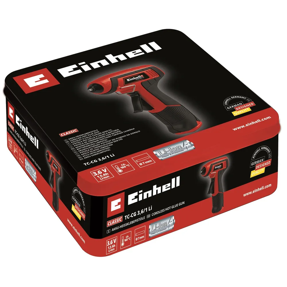 Клеевой пистолет Einhell TC-CG 3.6/1 Li 4522190 подходит для склеивания бумаги, картона, тканей, кожи, керамики и т.д. Благодаря компактным размерам и питанию от аккумулятора удобен в работе.