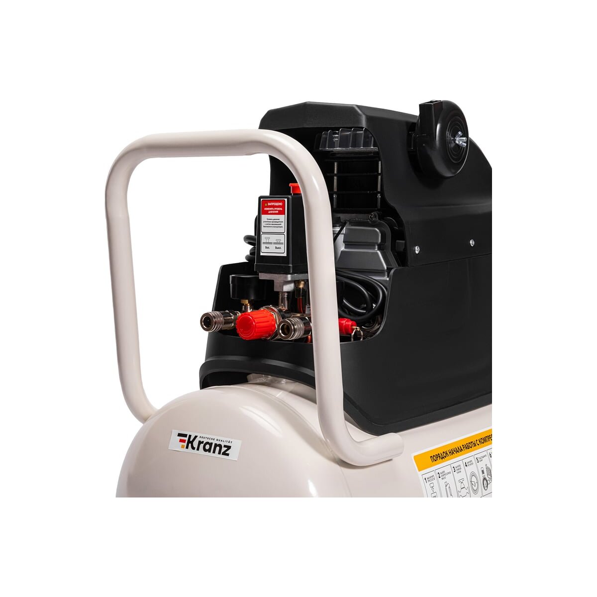 Контроль давления в ресивере и на выходе осуществляется с помощью двух манометров. Для безопасности установлен механический клапан сброса давления, срабатывающий при превышении максимального давления в ресивере. Пластиковый кожух снижает уровень шума и защищает от соприкосновения с нагретыми частями оборудования. Для повышения устойчивости компрессор оснащен двумя резиновыми опорами.