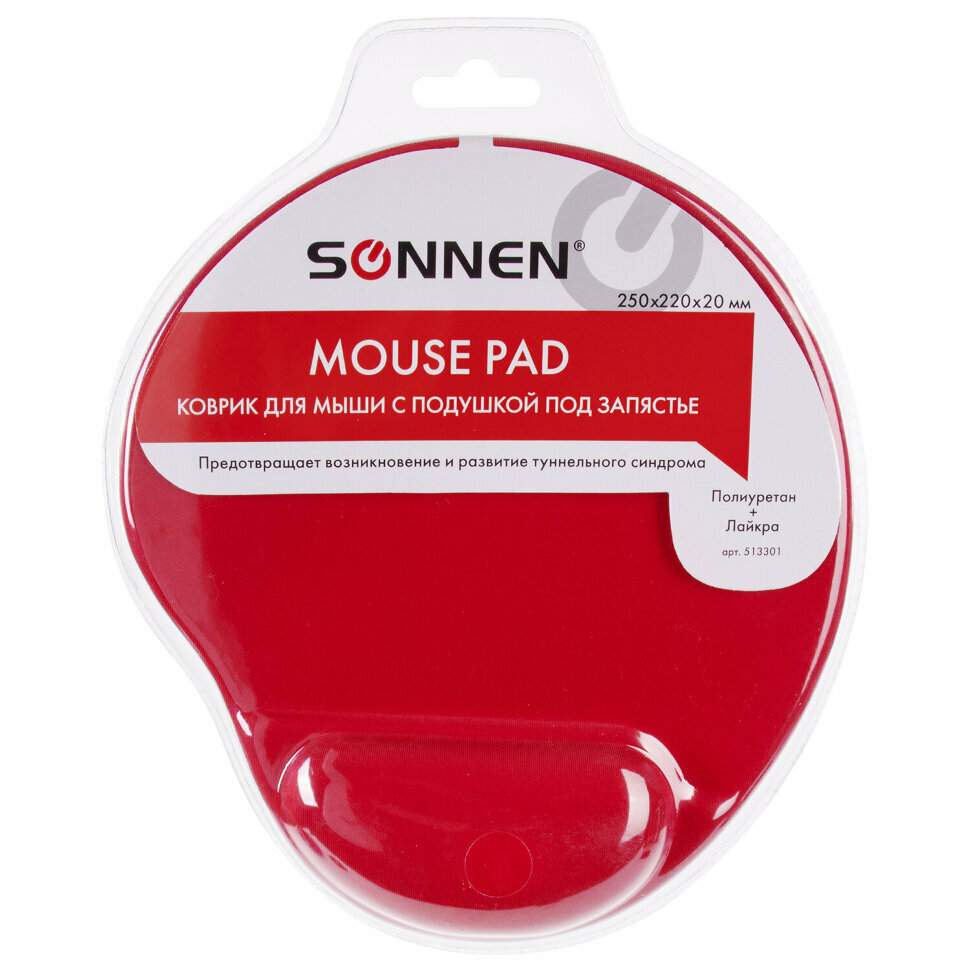 Коврик для мыши Sonnen 513301 полиуретан + лайкра, 250х220х20мм, красный