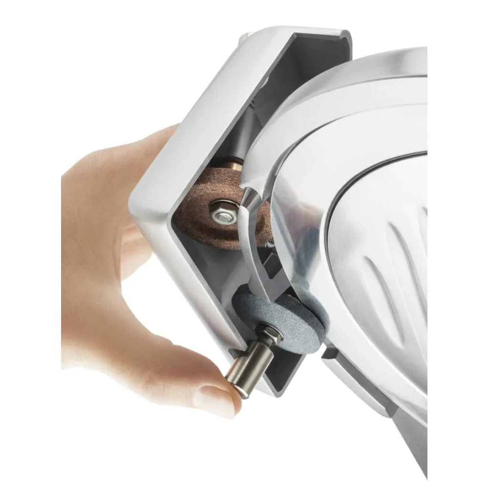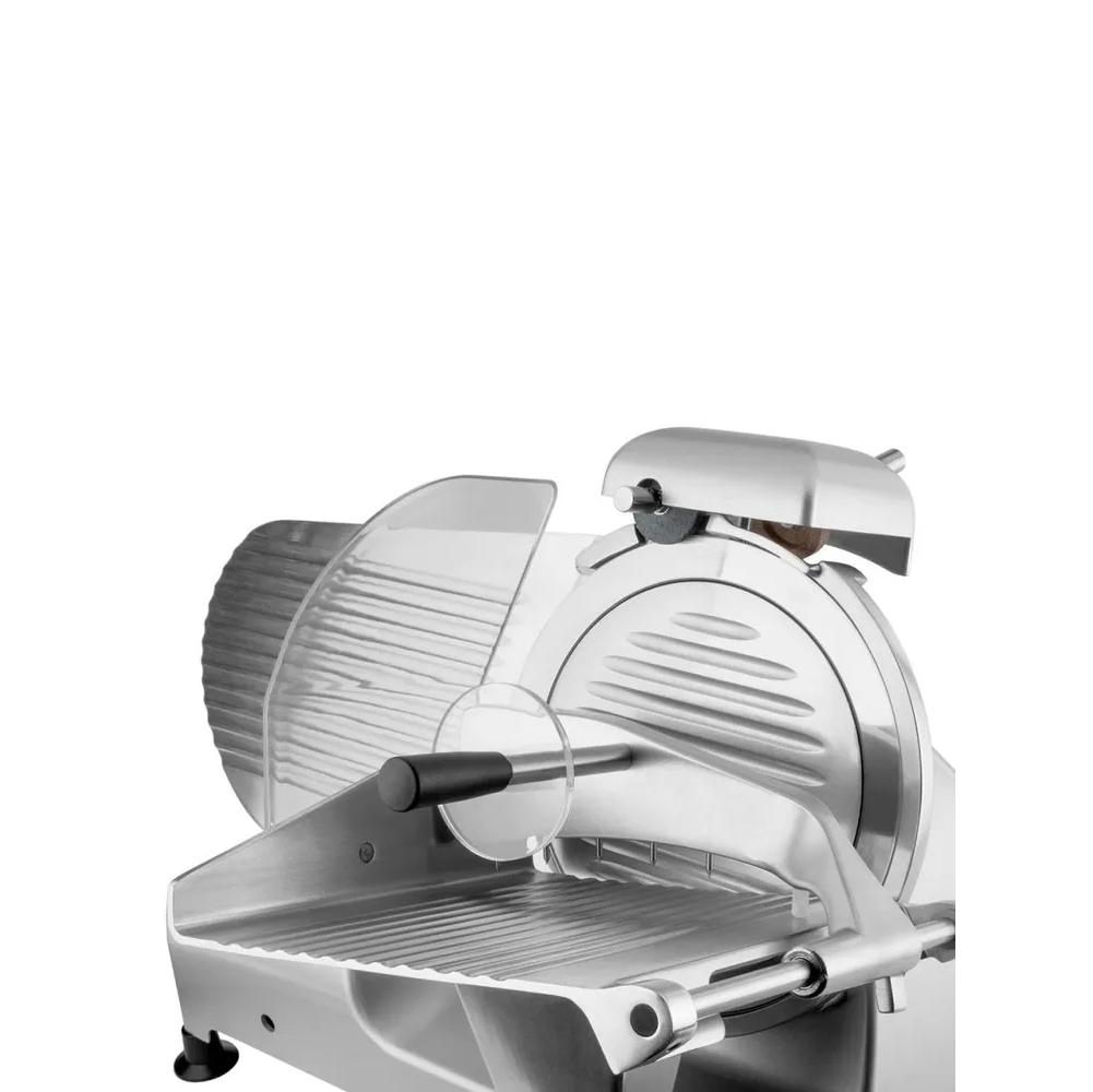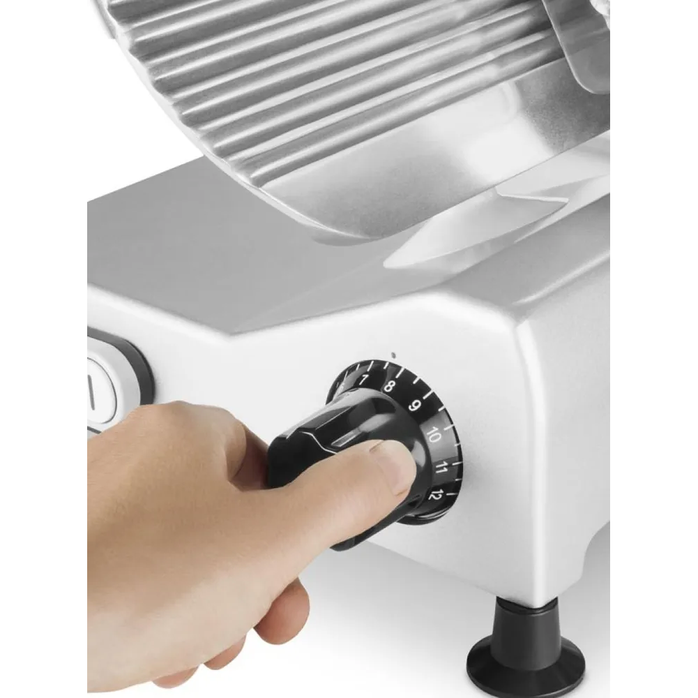 Прочный металлический корпус слайсера и регулируемые нескользящие ножки гарантируют исключительную устойчивость даже при нарезке самых твердых продуктов.