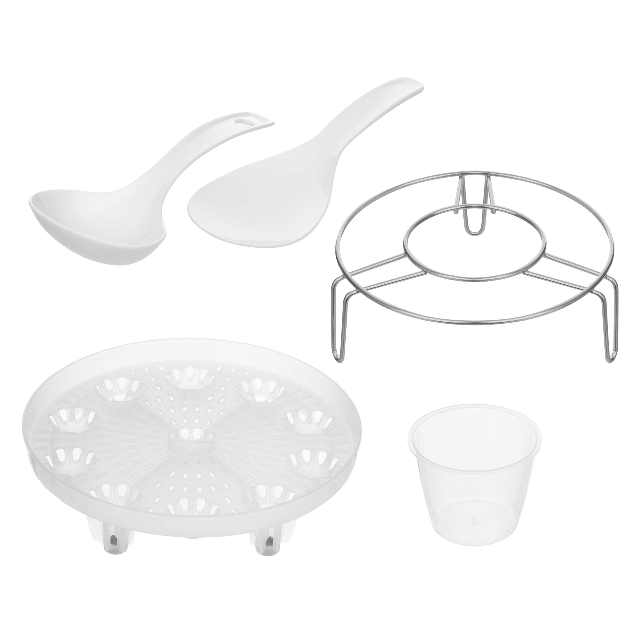 Комплектация: Скороварка с емкостью объемом 5,5 л, совочек для риса, ложка для риса, мерная емкость, металлический треножник, сетка для приготовления на пару