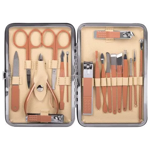 Состав набора: ножницы, ножницы закруглённые, кусачки, палочка для чистки ушей, ложка Уно, лопатка для кутикулы, пинцет, пушер для кутикулы (2 шт.), нож для педикюра (3 шт.), книпсеры для маникюра (2 шт.), нож для кутикулы, пилочка для ногтей, книпсер для педикюра, игла Видаля.