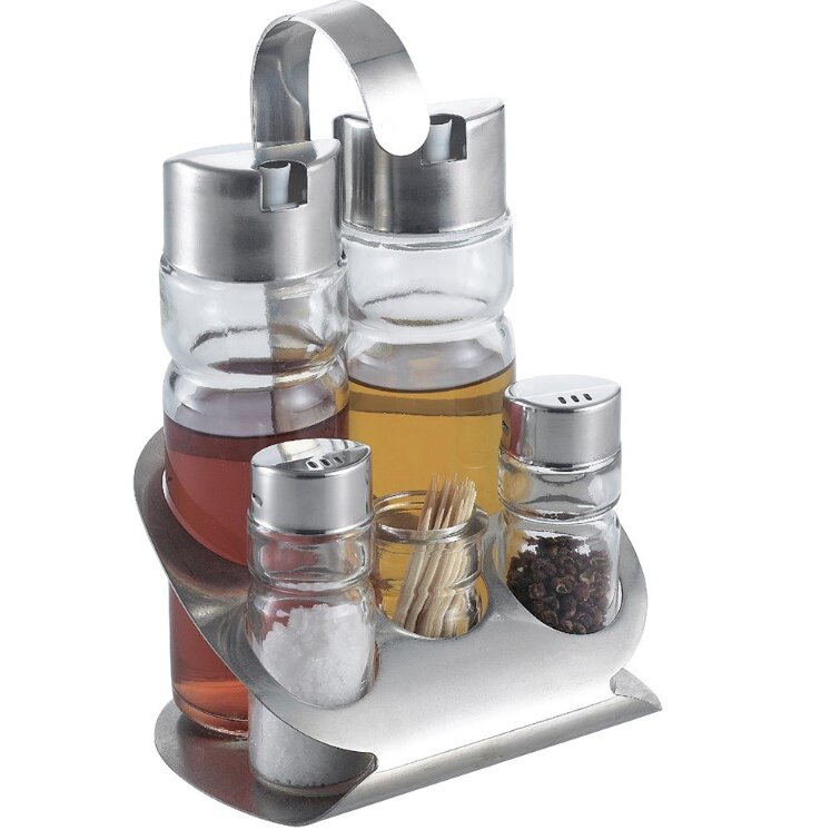 Набор для специй с ёмкостью для зубочисток, 5 предметов. Высококачественная нержавеющая сталь и стекло.