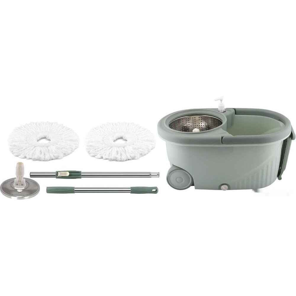 В набор для мытья полов входит ведро объёмом 7 л, вращающаяся швабра с насадкой из микрофибры, 1 запасная насадка и дозатор.