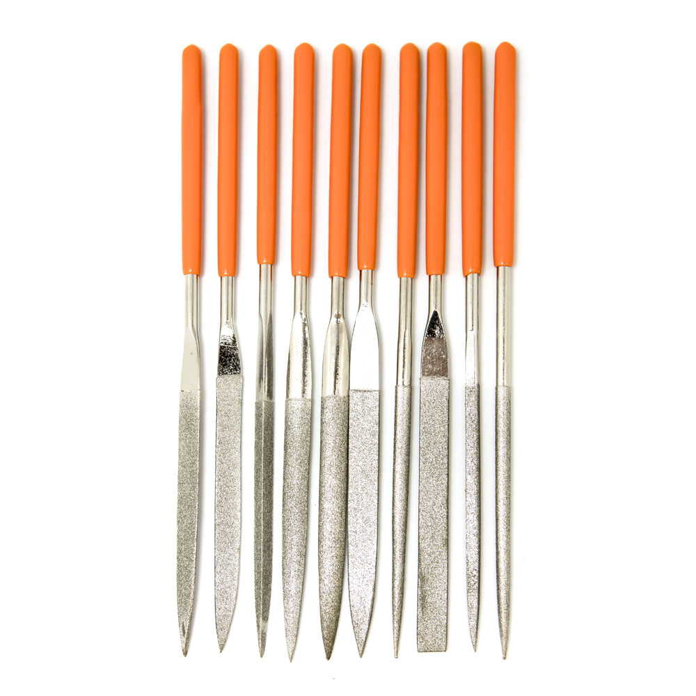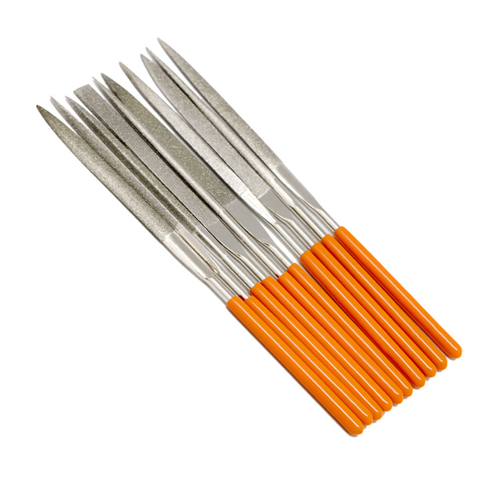 Набор надфилей алмазных применяется для точных доводочных работ различных поверхностей. Небольшие размеры позволяют применять их в труднодоступных местах. Обрезиненная рукоятка. В наборе 10 штук. Размер 160*70*4 мм.
