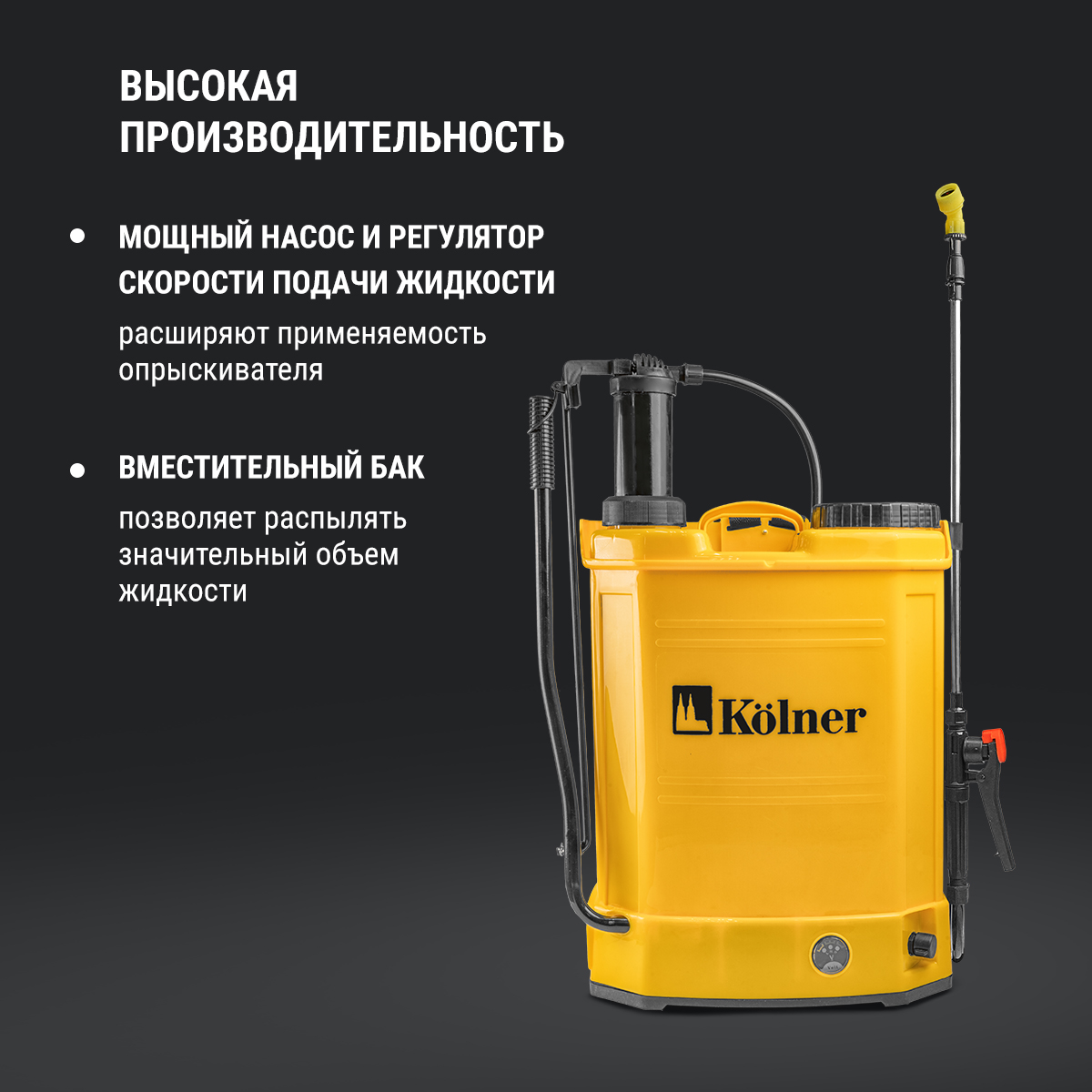 ВЫСОКАЯ ПРОИЗВОДИТЕЛЬНОСТЬ: мощный насос и регулятор скорости подачи жидкости расширяют применяемость опрыскивателя, а вместительный бак позволяет распылять значительный объем жидкости.