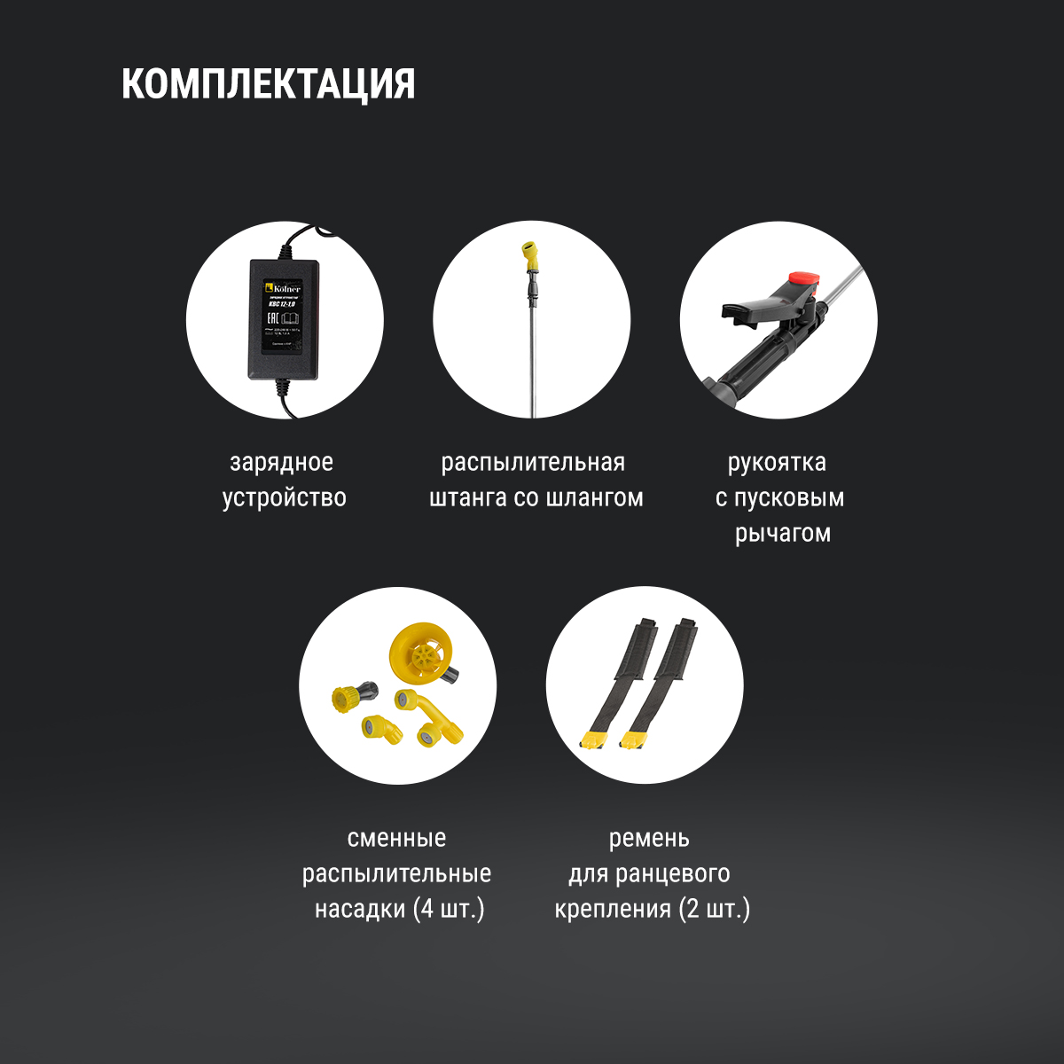 В комплекте Аккумулятор, Зарядное устройство, Распылительная штанга, шланг, Рукоятка с пусковым рычагом, сменная распылительная насадка- 4 шт., Ремень для ранцевого крепления - 2 шт., Уплотнительное кольцо - 1 комплект