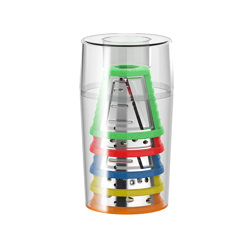 Моторный блок, блок овощерезки, мелкая терка, крупная терка, терка-измельчитель, шинковка для тонких ломтиков, шинковка для крупных ломтиков, органайзер для хранения сменных насадок, толкатель, руководство по эксплуатации