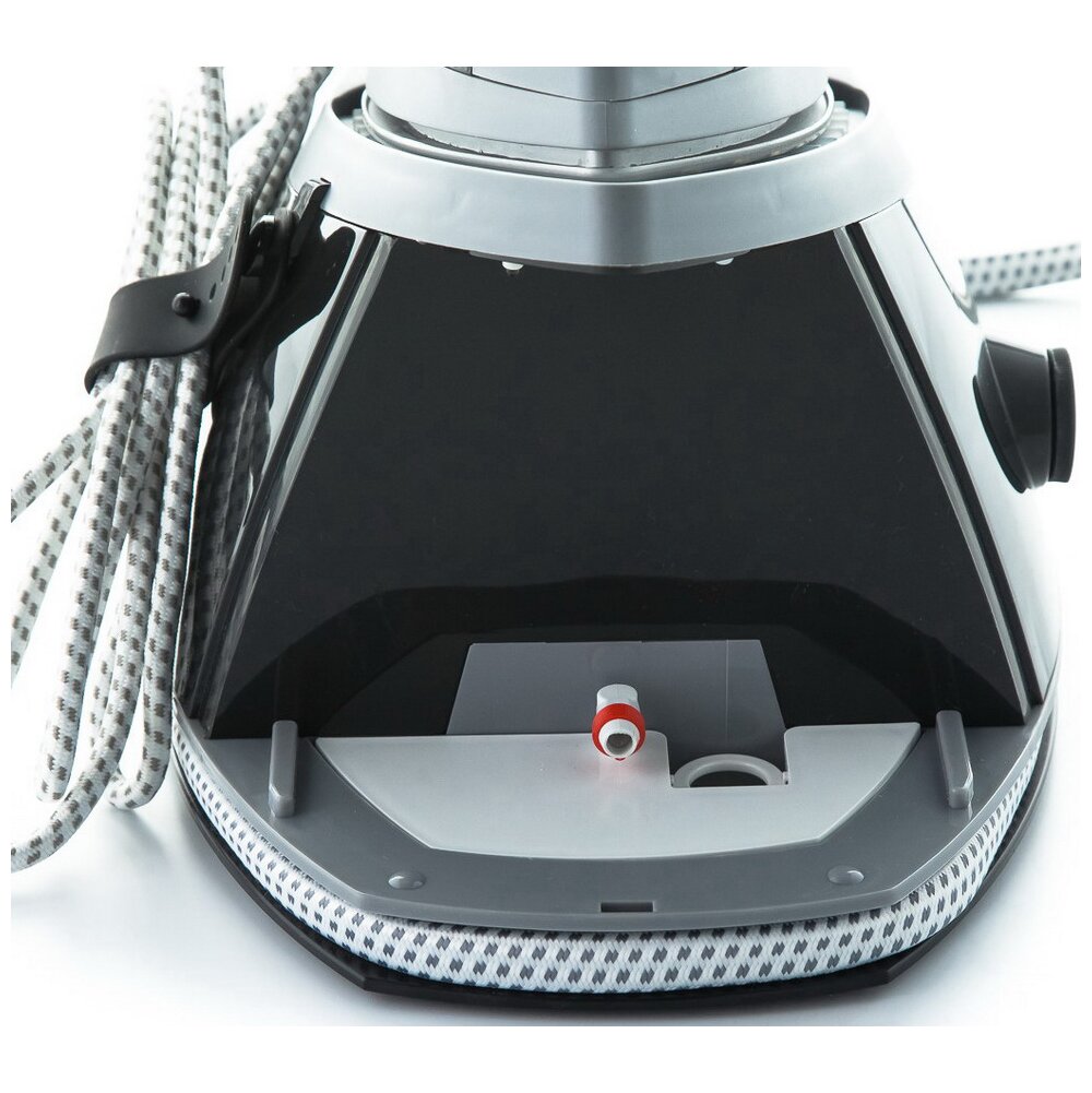 Парогенератор оснащен съемным резервуаром для воды (его объем - 1 л). Такого запаса воды хватает примерно на 30 минут беспрерывной работы. В случае, если вы хотите гладить дольше, просто вытащите съемный резервуар, наполните его водой и продолжайте гладить. По обеим сторонам резервуара парогенератора расположены ручки для удобной переноски прибора, а сам парогенератор размещается на специальной подставке.