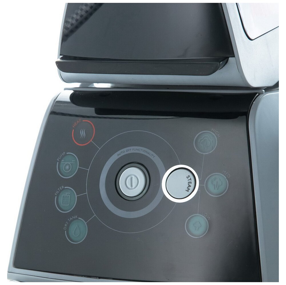 На корпусе парогенератора расположена панель управления. На ней есть кнопка включения питания со световым индикатором, а также кнопка переключения режимов подачи пара. Вы сможете настроить комфортный уровень подачи пара (сильный, средний или слабый) индивидуально для каждого изделия. На панели управления слева расположены индикаторы готовности пара, работы насоса, очистки от накипи и недостатка воды в резервуаре.