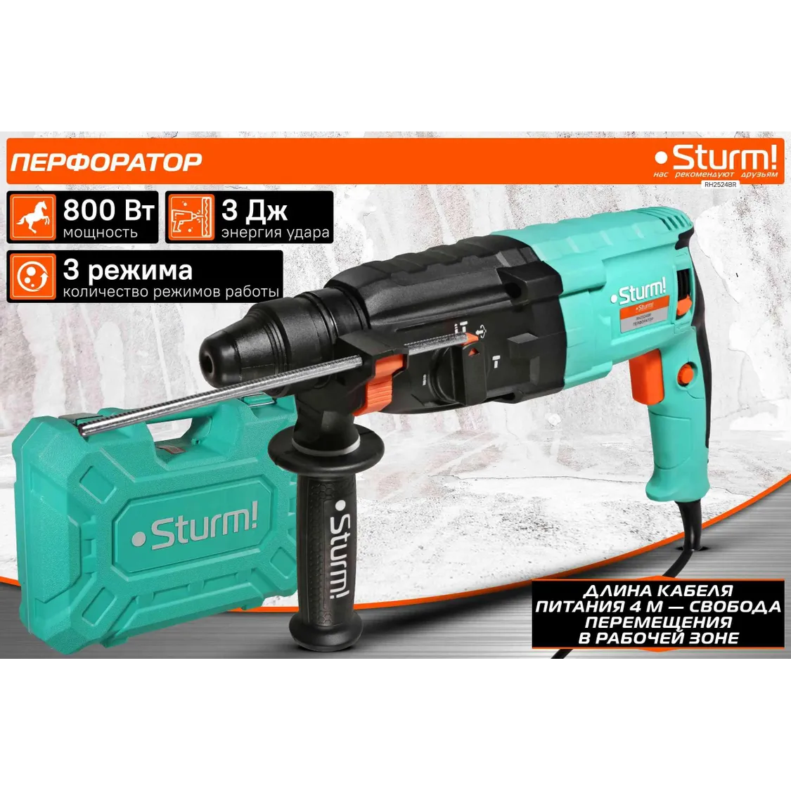 дополнительная рукоятка, ограничитель глубины сверления, предохранительная муфта, реверс