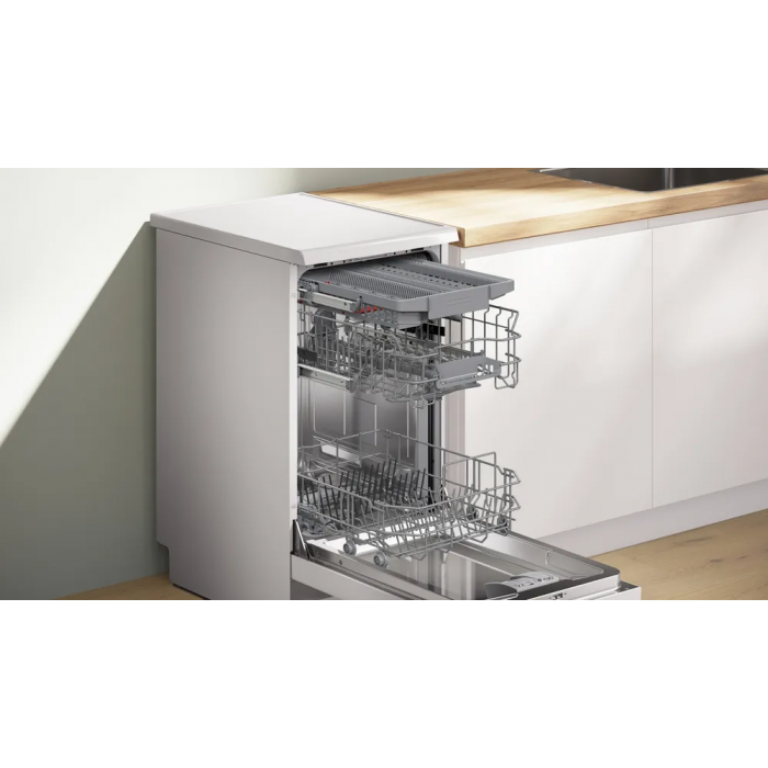 Представьте посудомоечную машину BOSCH SPS4HMW64Q из серии 4 – отдельностоящий вариант шириной 45 см в элегантном белом цвете, идеально подходящий для компактных пространств. Эта модель сочетает передовые функции с простотой использования, обеспечивая безупречную чистоту посуды благодаря интуитивным программам и интеллектуальным опциям. Система Vario Flex корзин позволяет настраивать пространство для любой нагрузки, от тарелок до кастрюль, а третий короб специально для столовых приборов оптимизирует хранение с двумя складными держателями в нижней корзине. Для удобства опция Rackmatic 3 регулирует высоту верхней корзины, а один подстаканник в верхней для надежной фиксации бокалов.