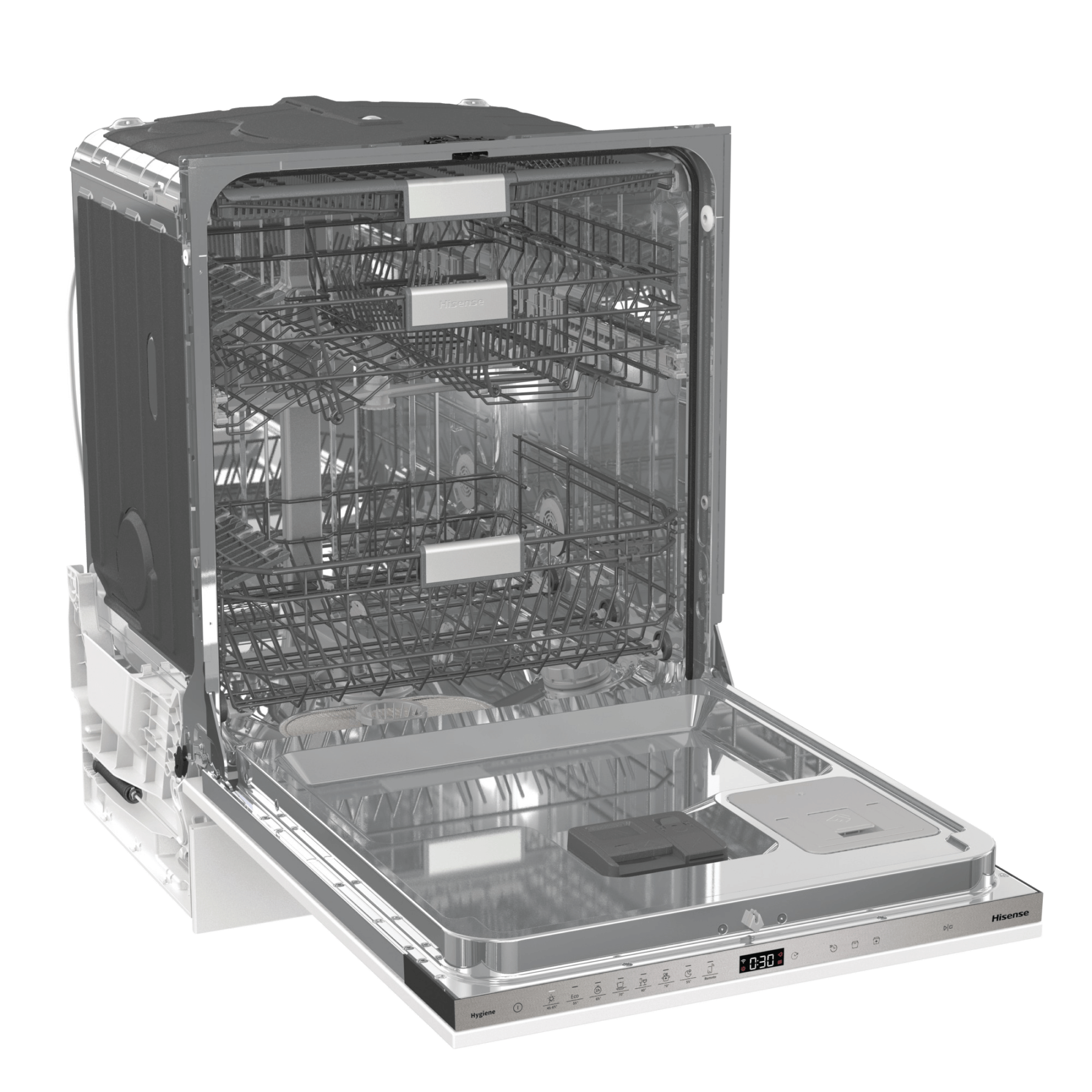Откидная дверца с расположенным в верхней торцевой части сенсорным блоком управления открывает доступ в камеру из нержавеющей стали с подсветкой и тремя пластиковыми разбрызгивателями. Максимальная температура воды на заливе — 70°C. Для размещения посуды предусмотрены верхняя, нижняя корзины, выдвижной лоток для столовых приборов, съемная подставка для бокалов.