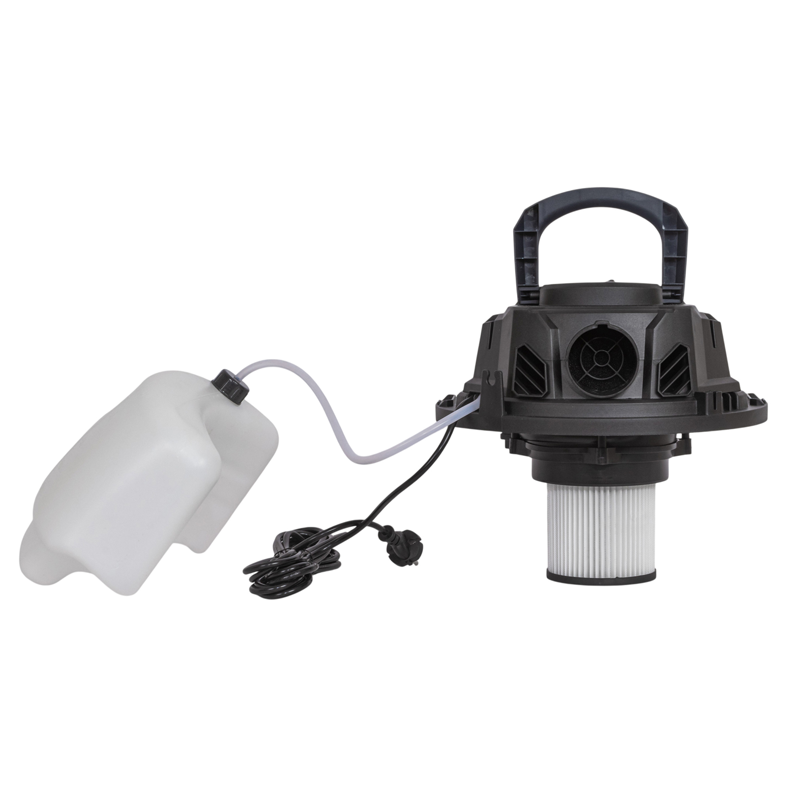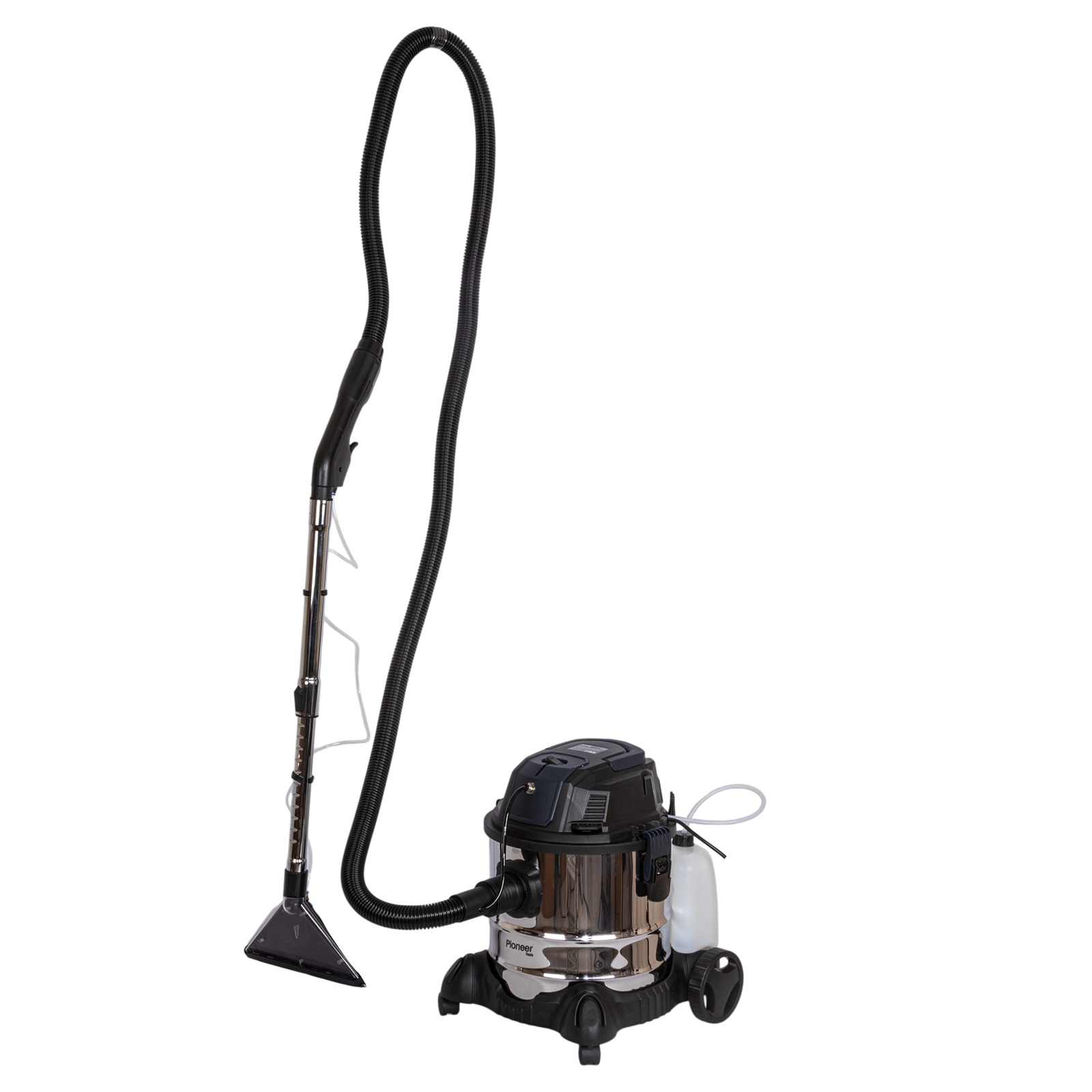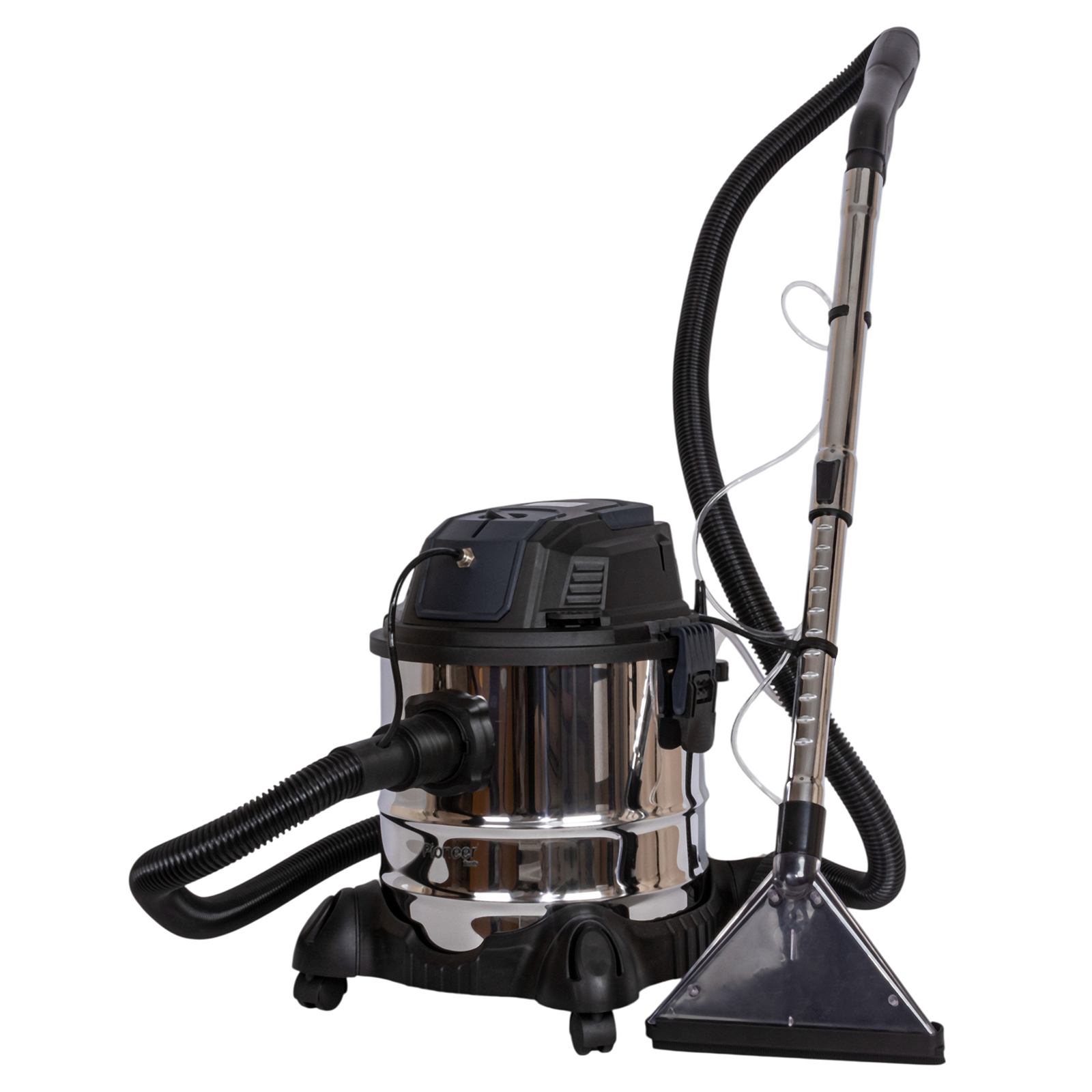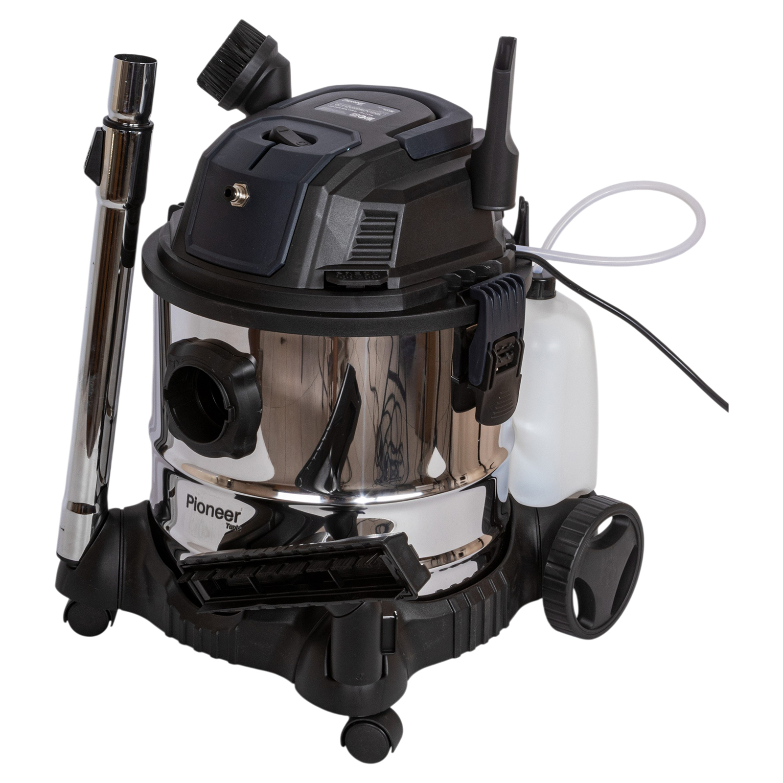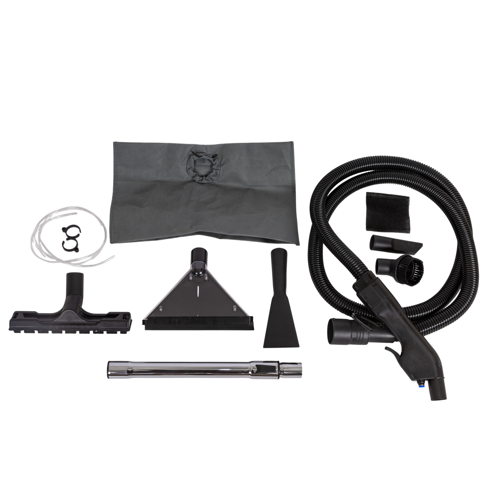 пылесос, большое колесо с кронштейном – 2 комплекта, роликовое колесо – 2 шт., гибкий шланг, металлическая телескопическая трубка, нетканый фильтр, насадка для сухой уборки, треугольная насадка для влажной уборки 26 см., треугольная насадка для влажной уборки 8 см., щелевая насадка, насадка-щётка, губчатый фильтр, НЕРА-фильтр, канистра для жидкости, гибкие трубки, руководство по эксплуатации