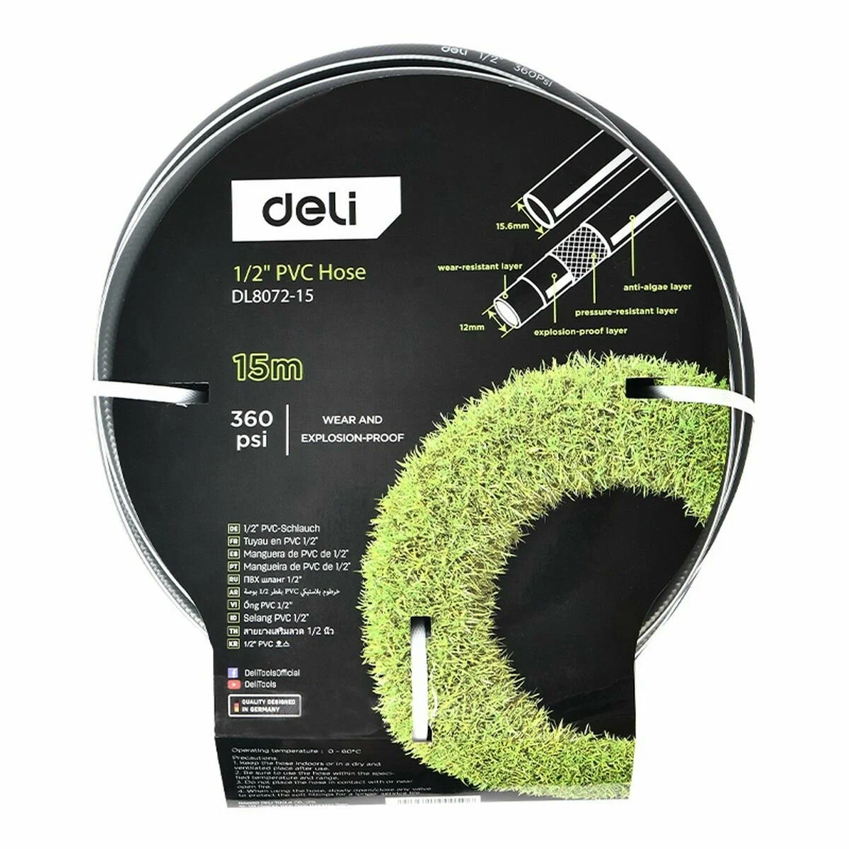 Садовый поливочный шланг DeliDL8072-15 используется для полива растений, деревьев, кустарников и других садовых задач. С его помощью можно помыть фасад здания или дорожку к нему, забор, автомобиль или велосипед и даже домашних животных в жаркий летний день.