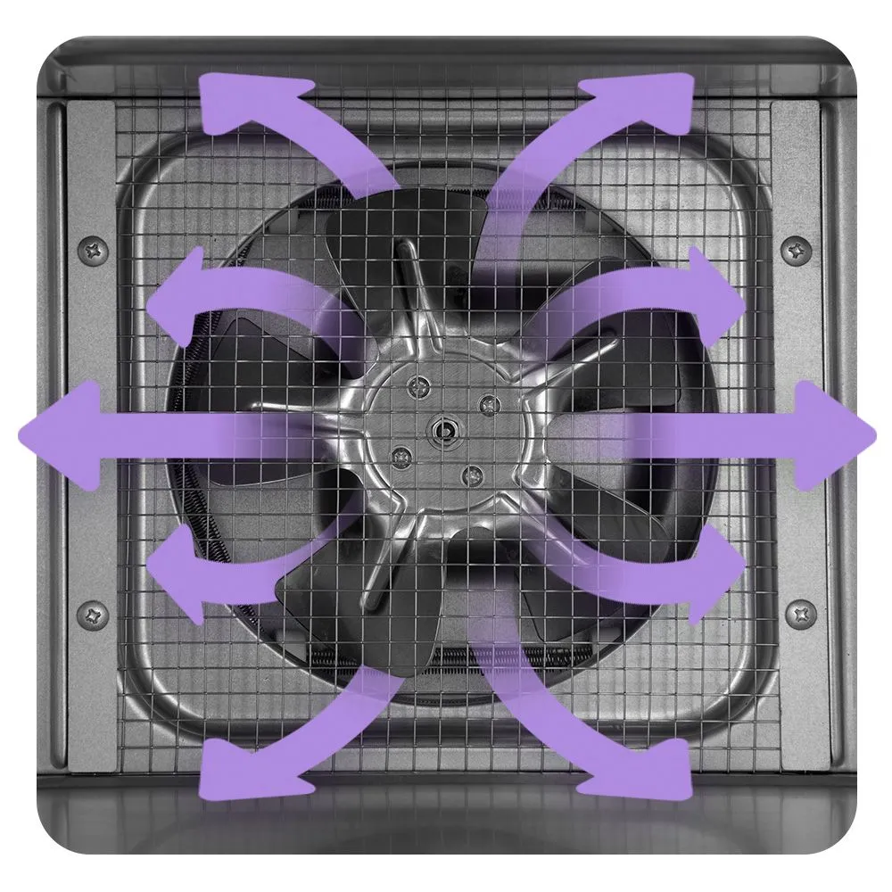 В сушилку установлен нагревательный элемент и вентилятор, обеспечивающий равномерное распределение нагретого воздуха по всему объёму камеры. Благодаря горизонтальному обдуву смешение запахов при одновременной сушке разных продуктов минимально.