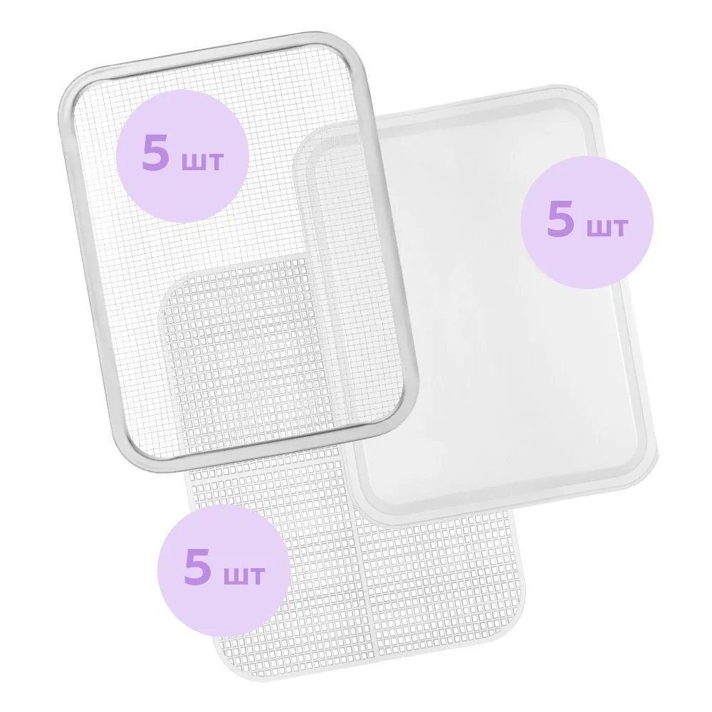В комплект входят 5 металлических поддонов, 5 сплошных пластиковых поддонов и 5 сеток.
