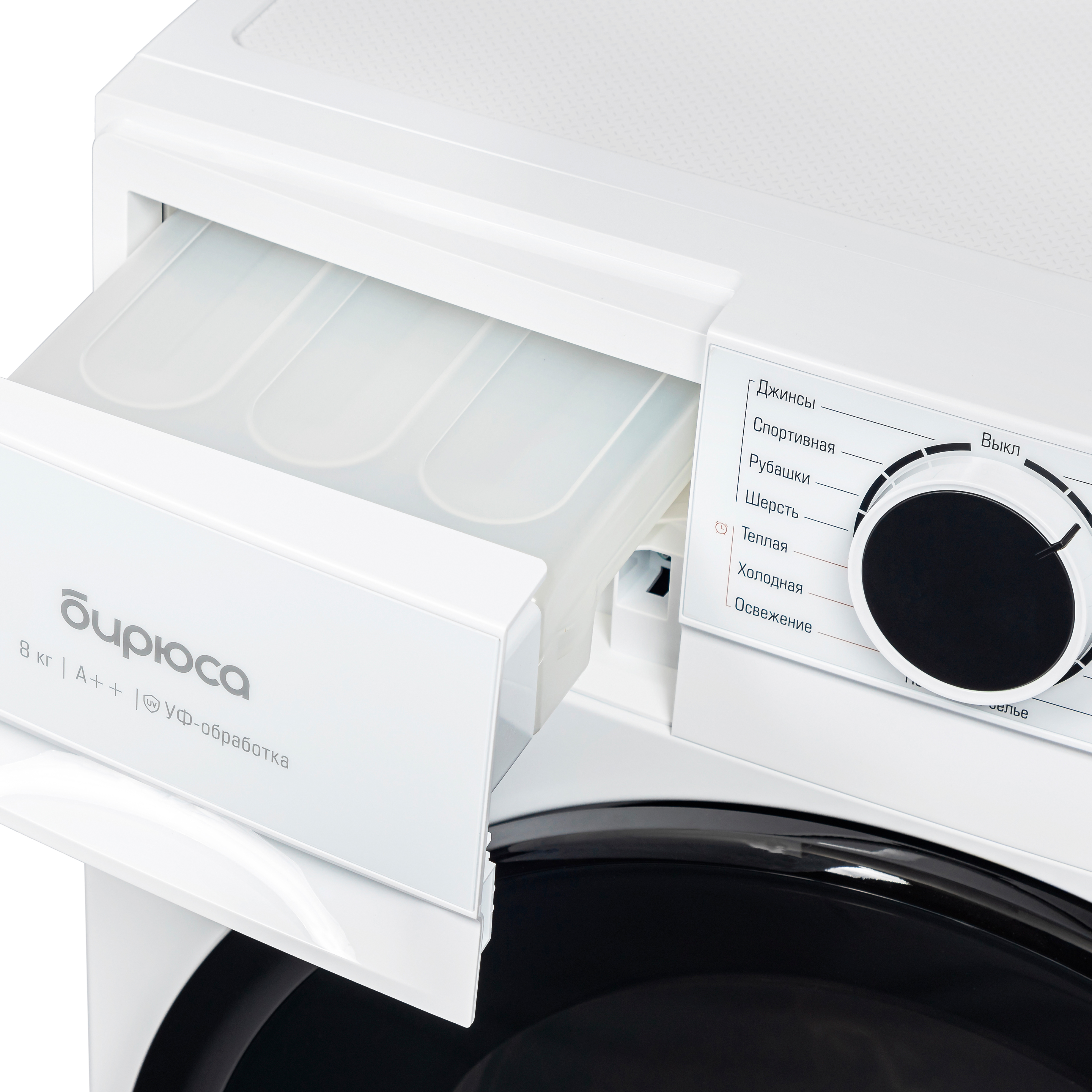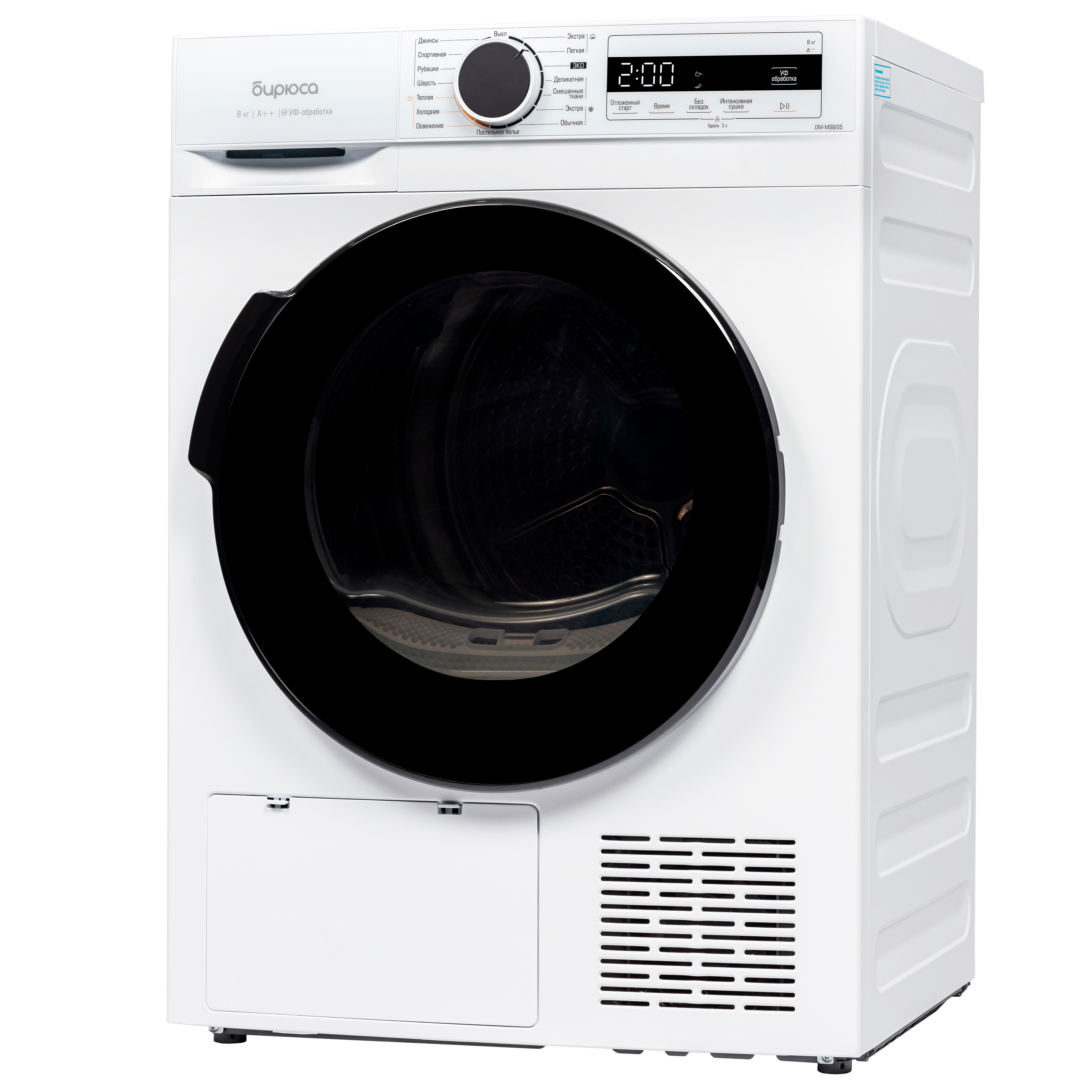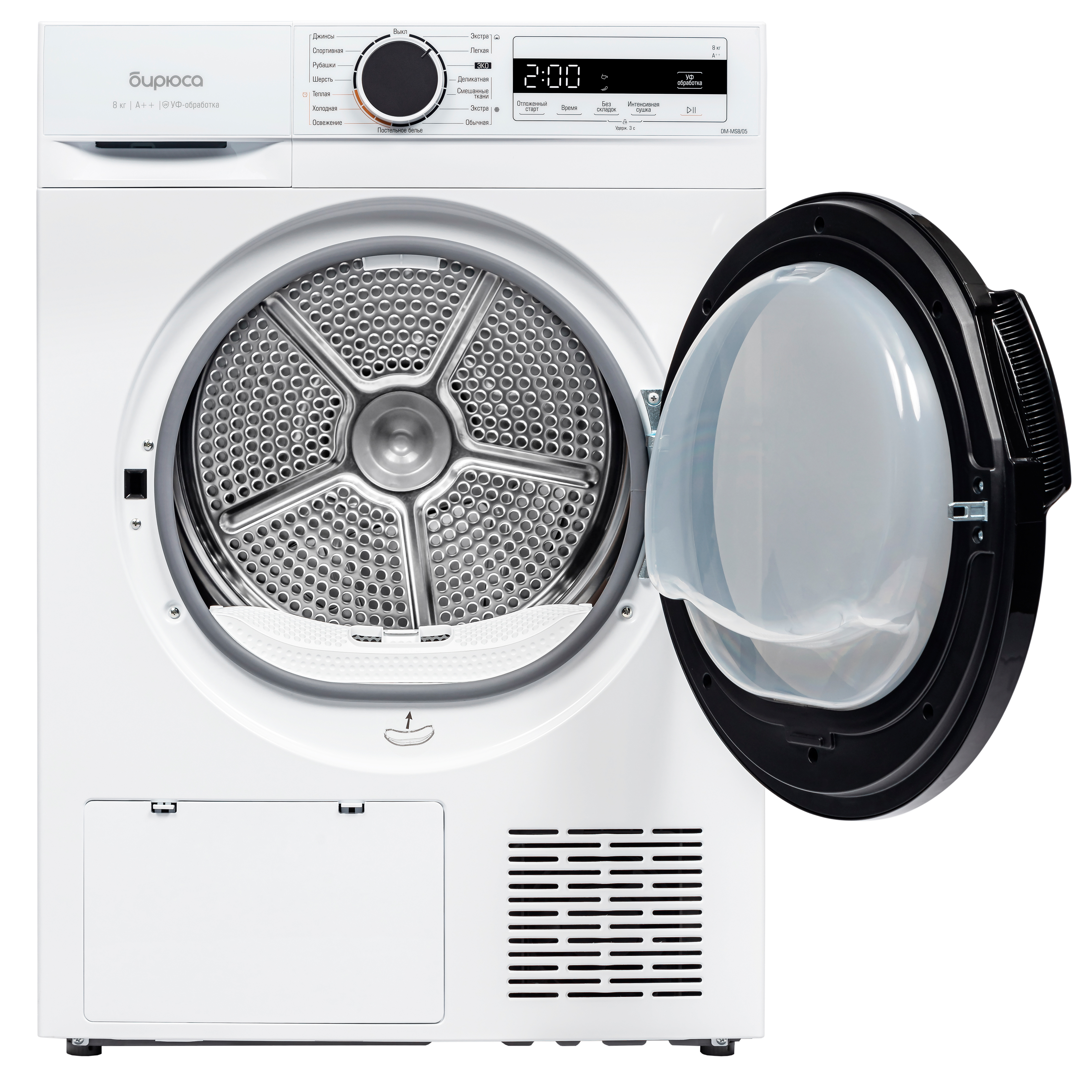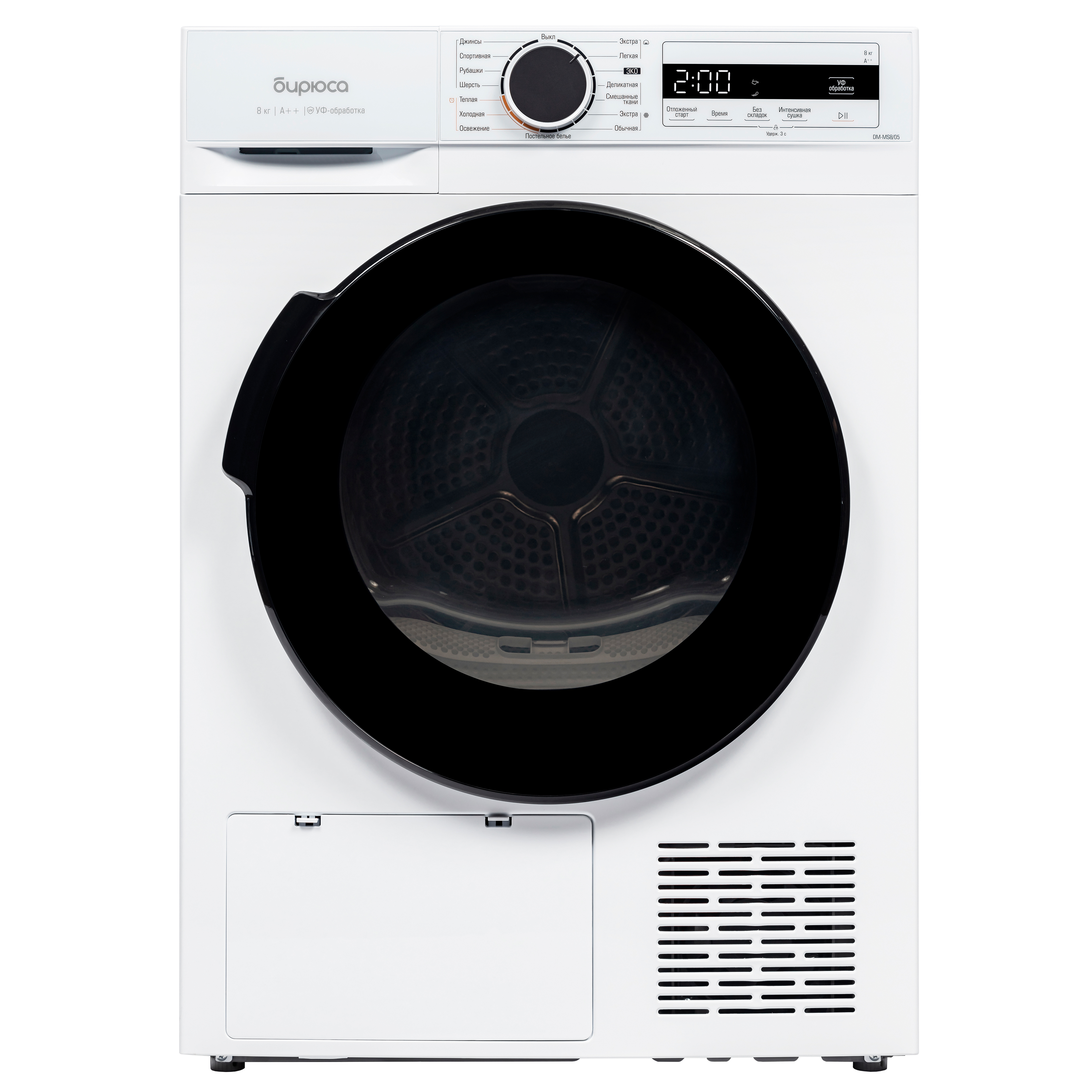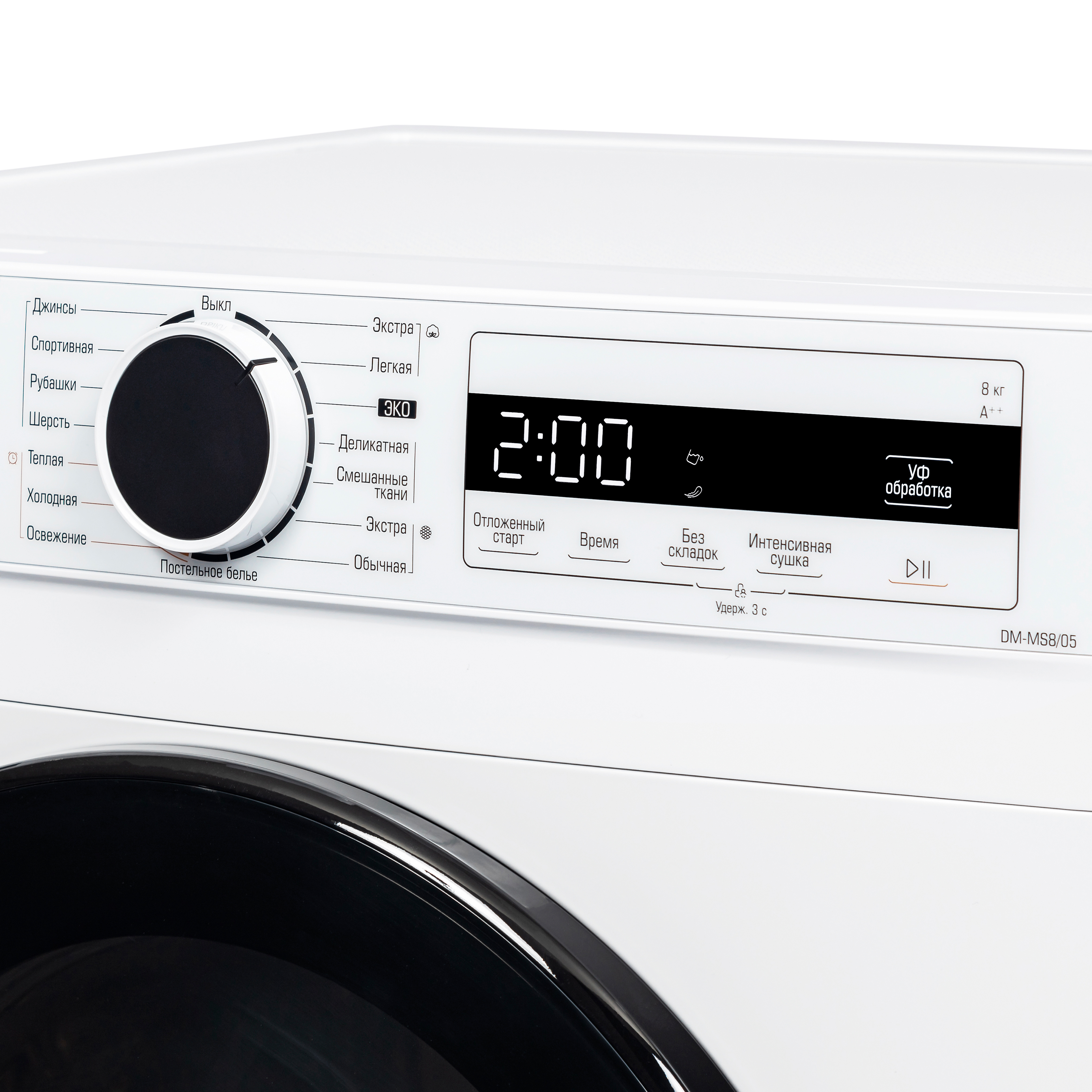 Дополнительные функции: Без складок, Интенсивная сушка, Отложенный старт, Блокировка от детей, УФ-обработка, Подсветка барабана