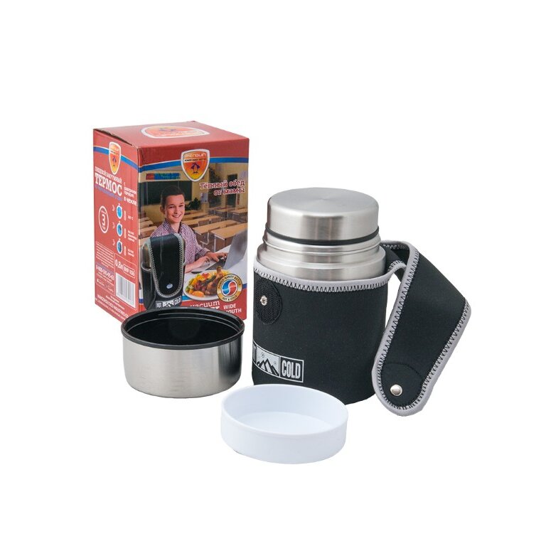 Термос с широким горлом, объемом 0,8 литра с металлической пробкой (без кнопки), c дополнительной чашкой, в чехле и подарочной коробке