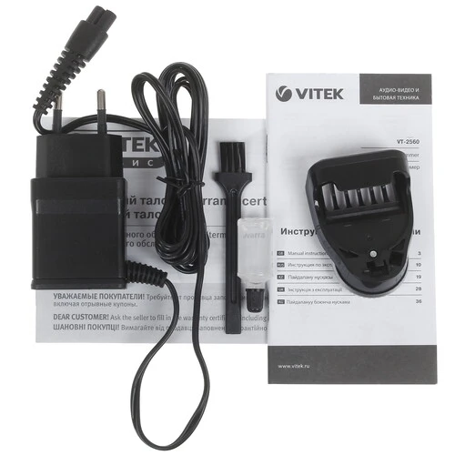 Vitek VT-2560 поддерживает длину стрижки до 10 мм, минимальная длина достигает 0.5 мм. Триммер предусматривает 20 установок длины, которая настраивается при помощи регулятора. Устройство с одной насадкой выполнено во влагозащитном корпусе, что позволяет мыть триммер под струей воды. Лезвия прибора изготовлены из нержавеющей стали. Устройство с вибрационным двигателем предусматривает в комплекте масло и щеточку для чистки, что позволяет удобно ухаживать за прибором.