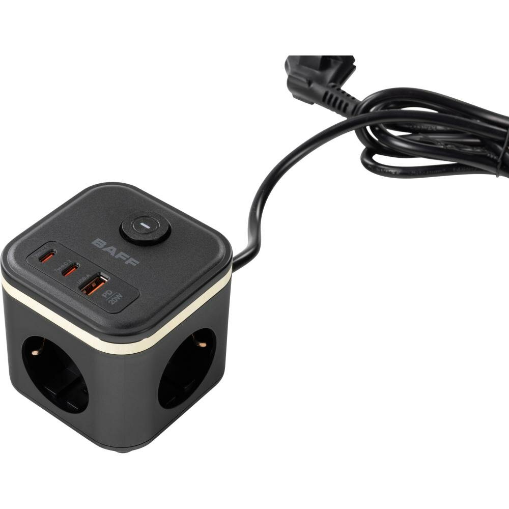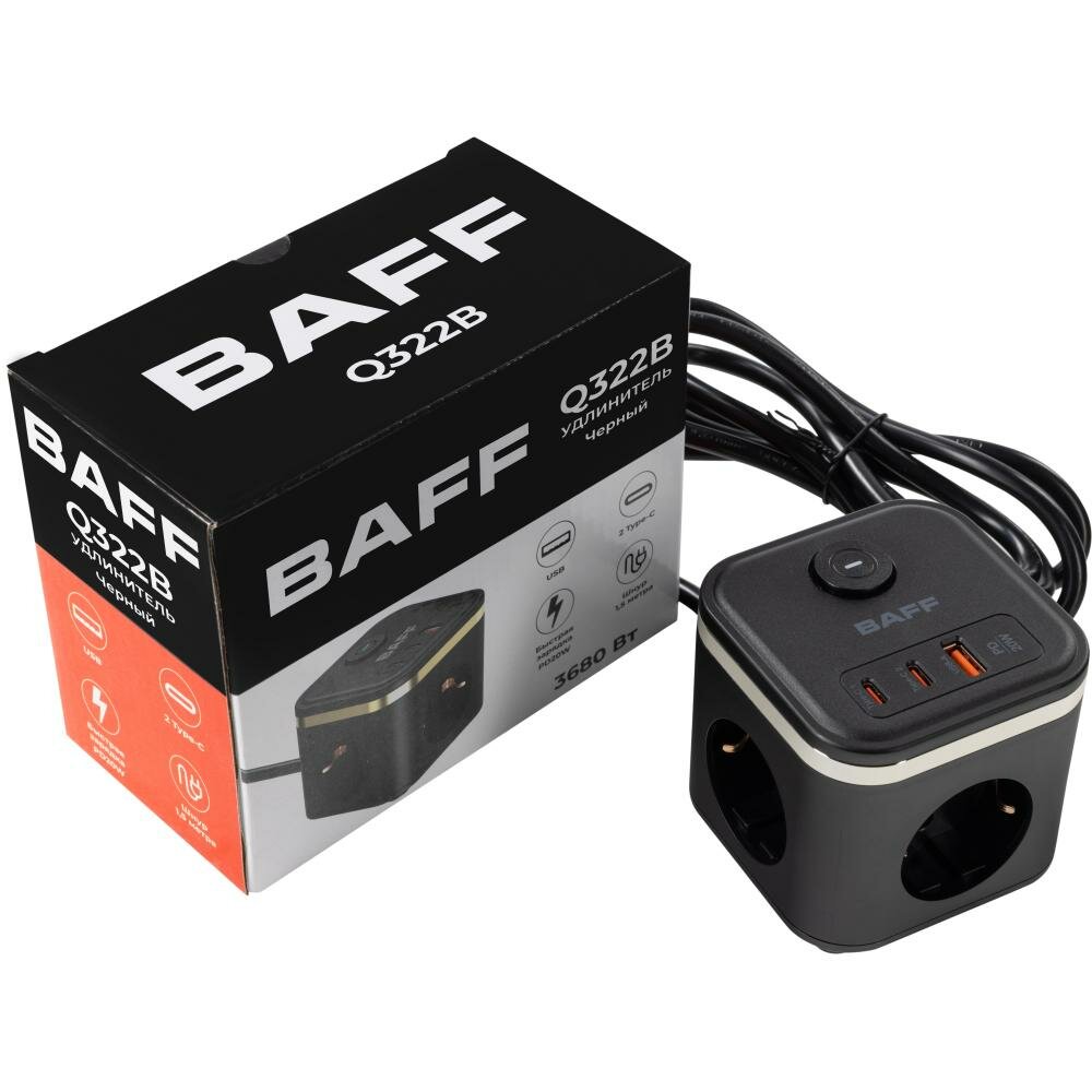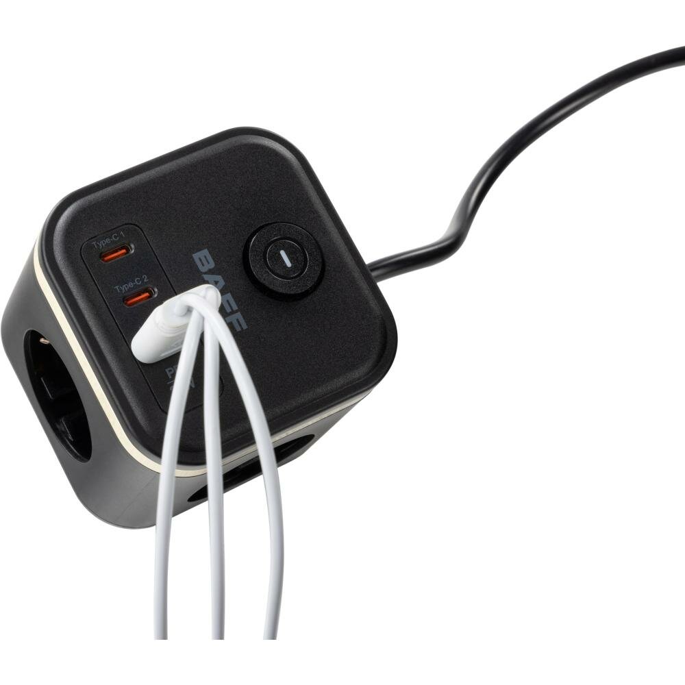Удлинитель BAFF Q322, 3 розетки АС, 2 порта Type-C, порт USB-A,