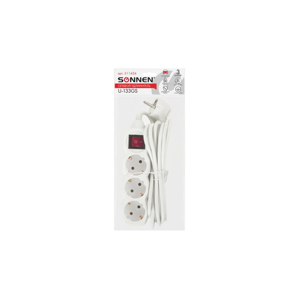 Удлинитель сетевой SONNEN U-133GS (511434) 3 розетки, c заземлением, выключатель, 10А, 3м, белый