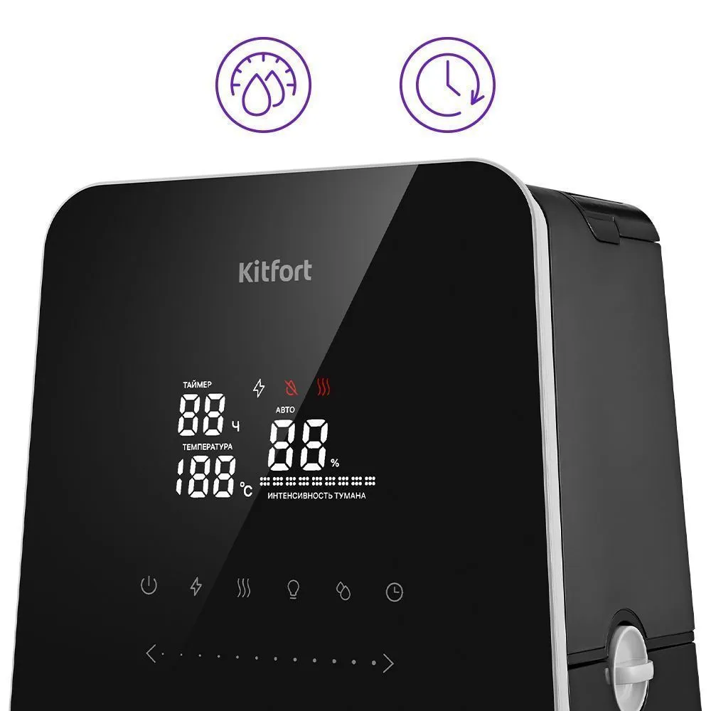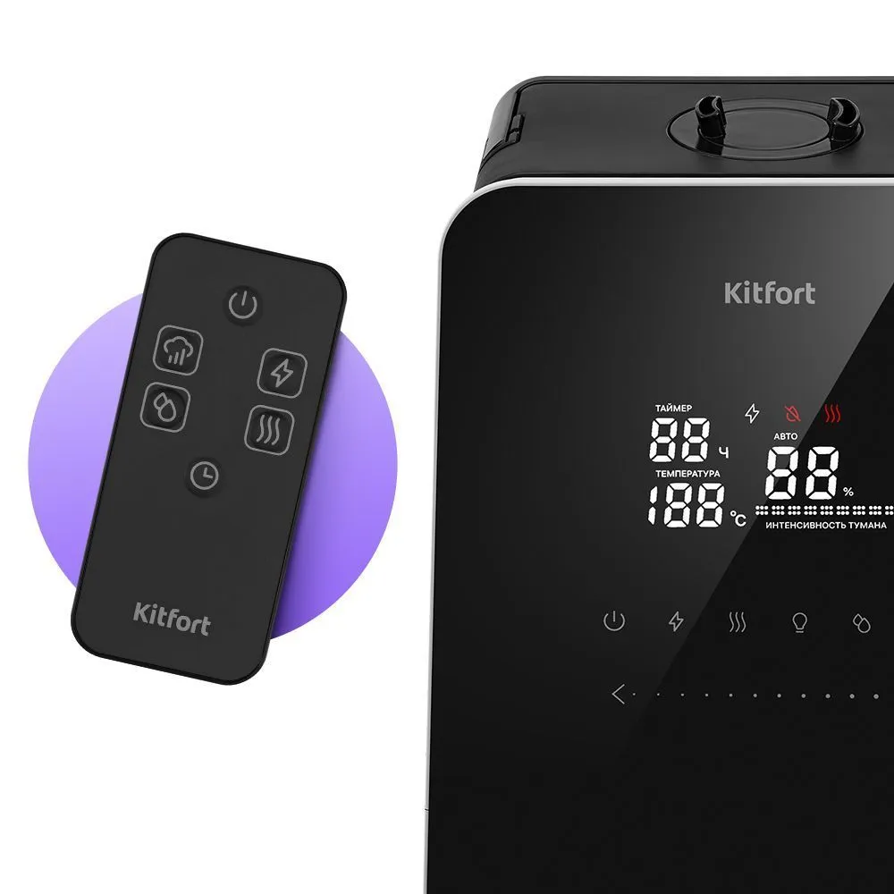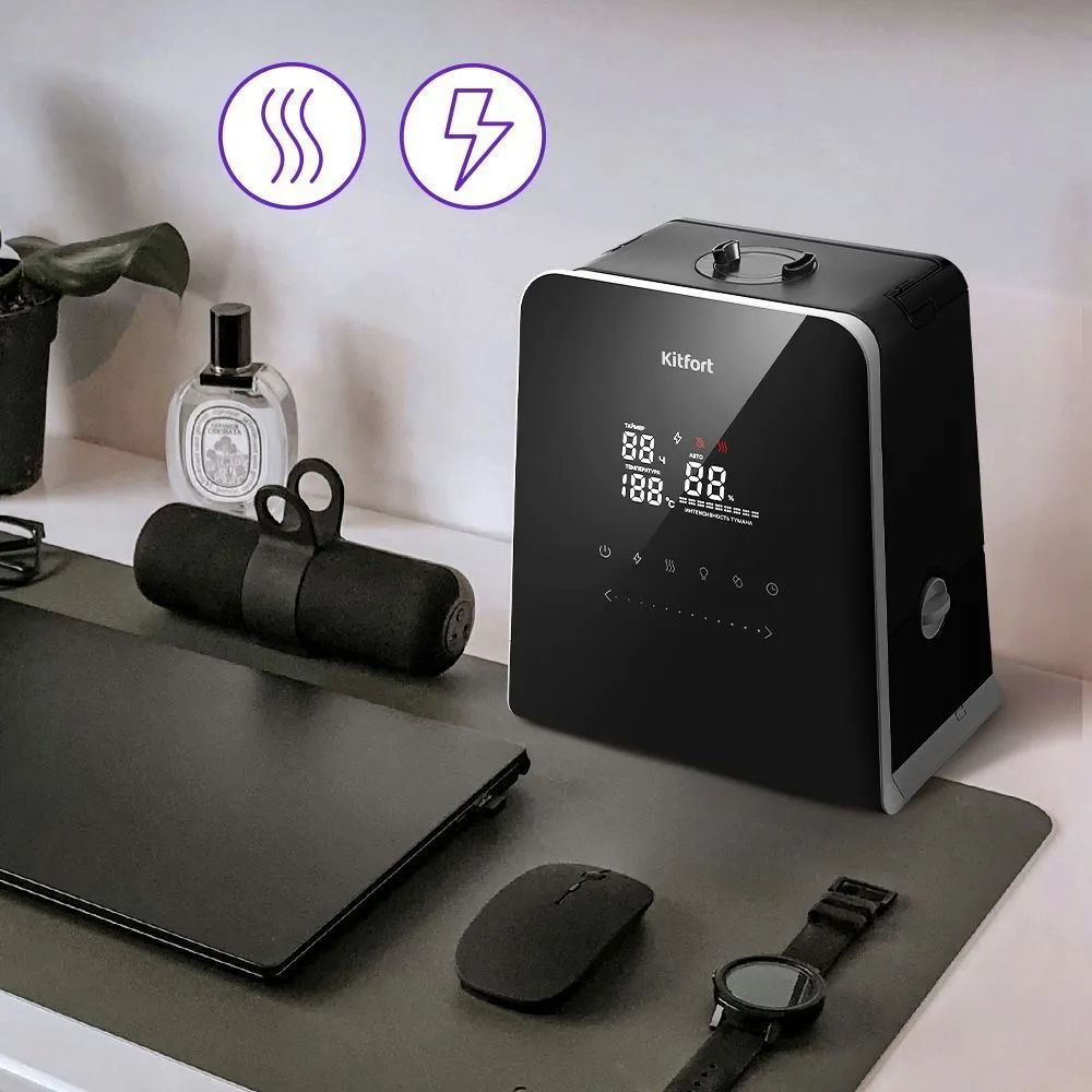КТ-3823 имеет функции «Подогрев» и «Ионизация». Ионизация – процесс наполнения помещения отрицательно заряженными ионами воздуха, который очень полезен для организма человека. Подогрев воды и подача тёплого тумана позволяет быстрее увлажнить воздух.
