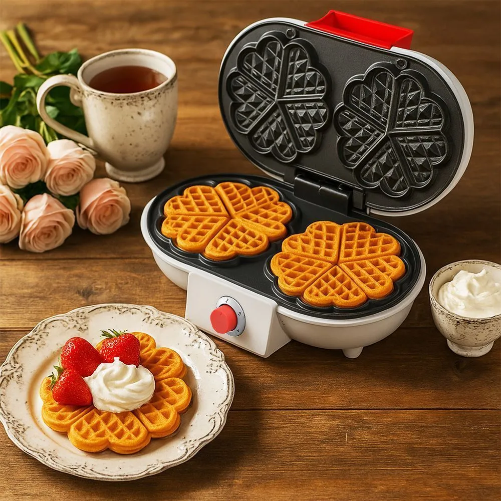 Вафельница предлагает множество форматов для любителей десертов. Вы можете приготовить две большие вафли в форме цветка, чтобы насладиться их эффектным внешним видом. Или 10 маленьких вафель в виде сердечек, которые займут меньше времени приготовления.